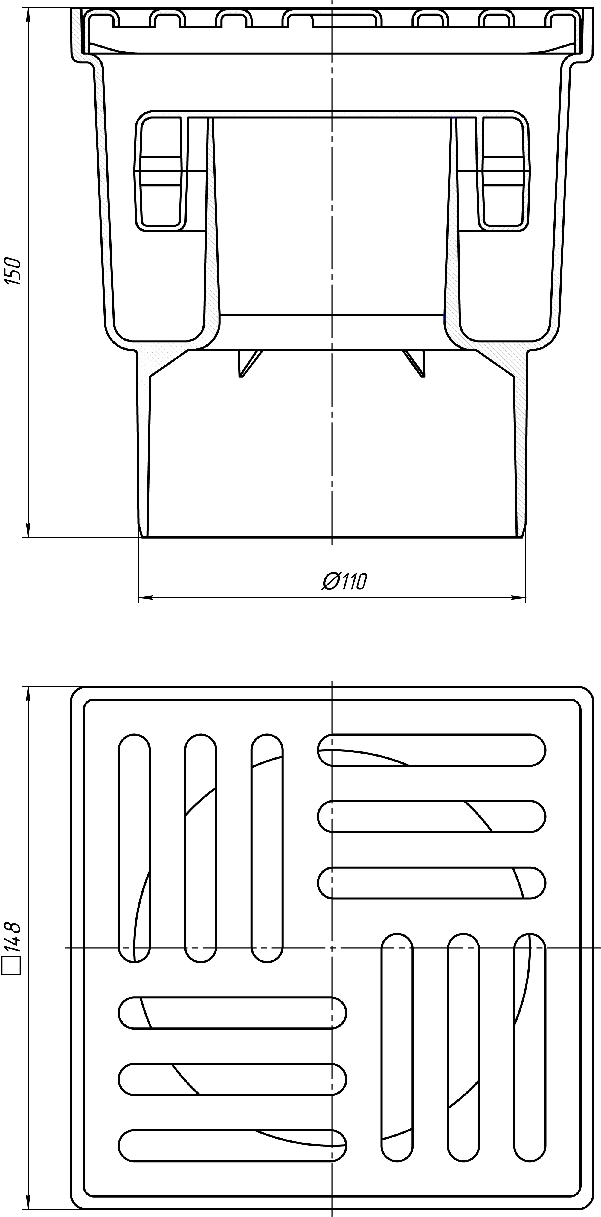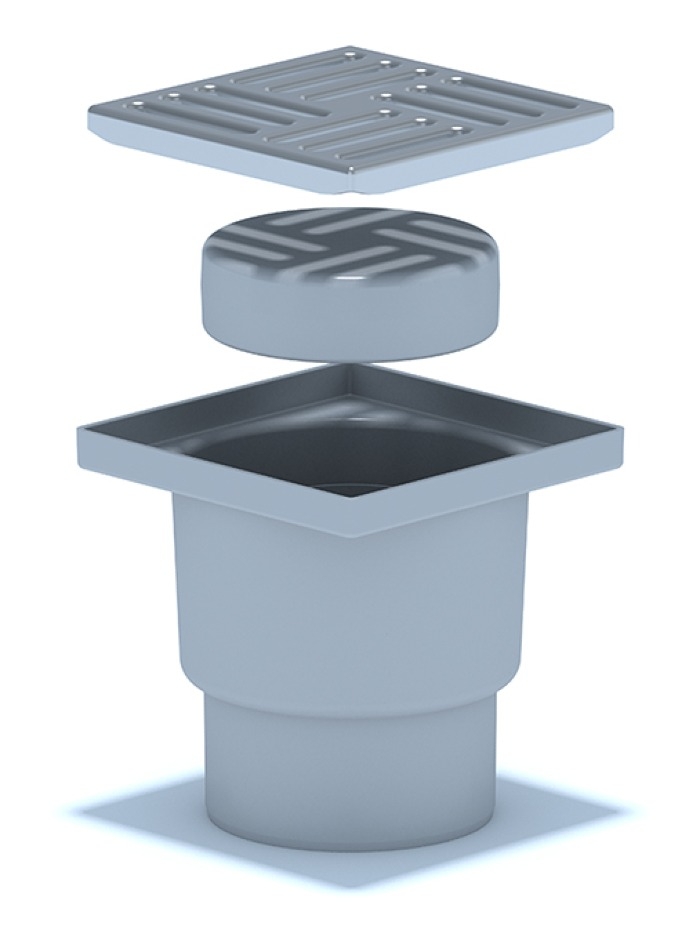 Сухой трап вертикальный нерегулируемый, с выпуском 110 мм, с нержавеющей решеткой 15×15 см.