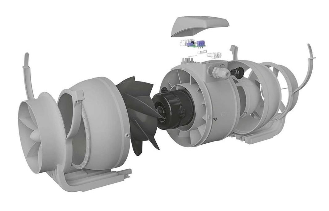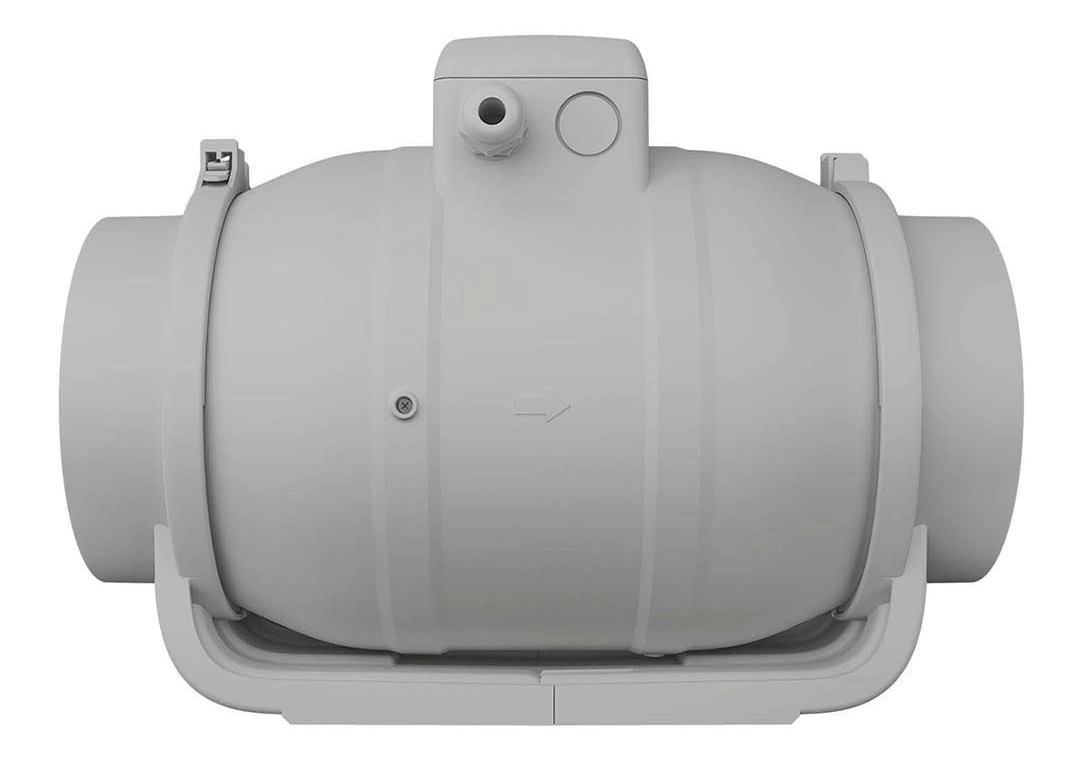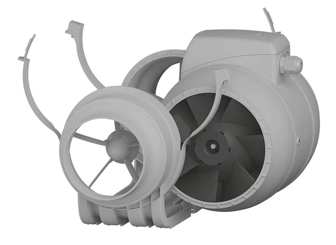 Имеет разборную конструкцию, что упрощает обслуживание: съемный центральный блок с двигателем, крыльчаткой и клеммной коробкой крепится к боковым патрубкам пластиковыми хомутами.