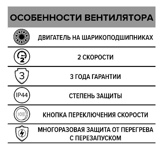 Вентилятор имеет две скорости работы, выбор скорости осуществляется при подключении питания к клеммам, либо с помощью кнопки (входит в комплект, устанавливается самостоятельно по желанию пользователя).