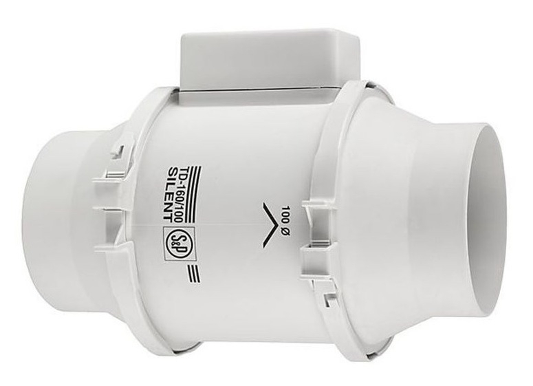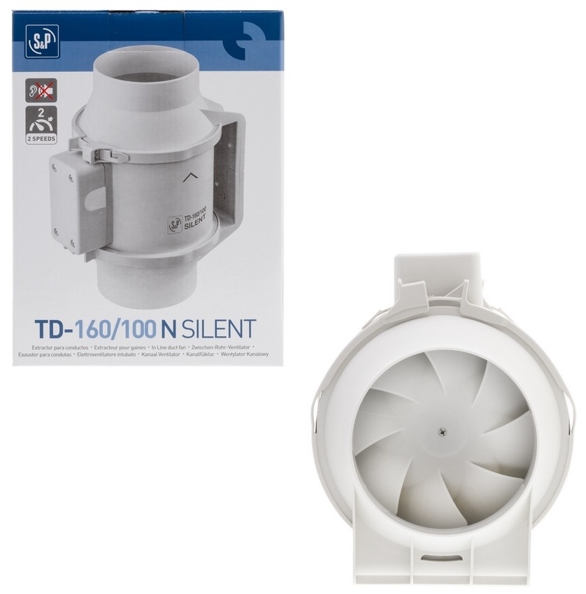 Вентилятор канальный S&P / С&П TD-160/100 N Silent из пластика, белый, 220В, 100мм, 24дБ, размером 232х137.5х151мм, 29Вт / вентиляция