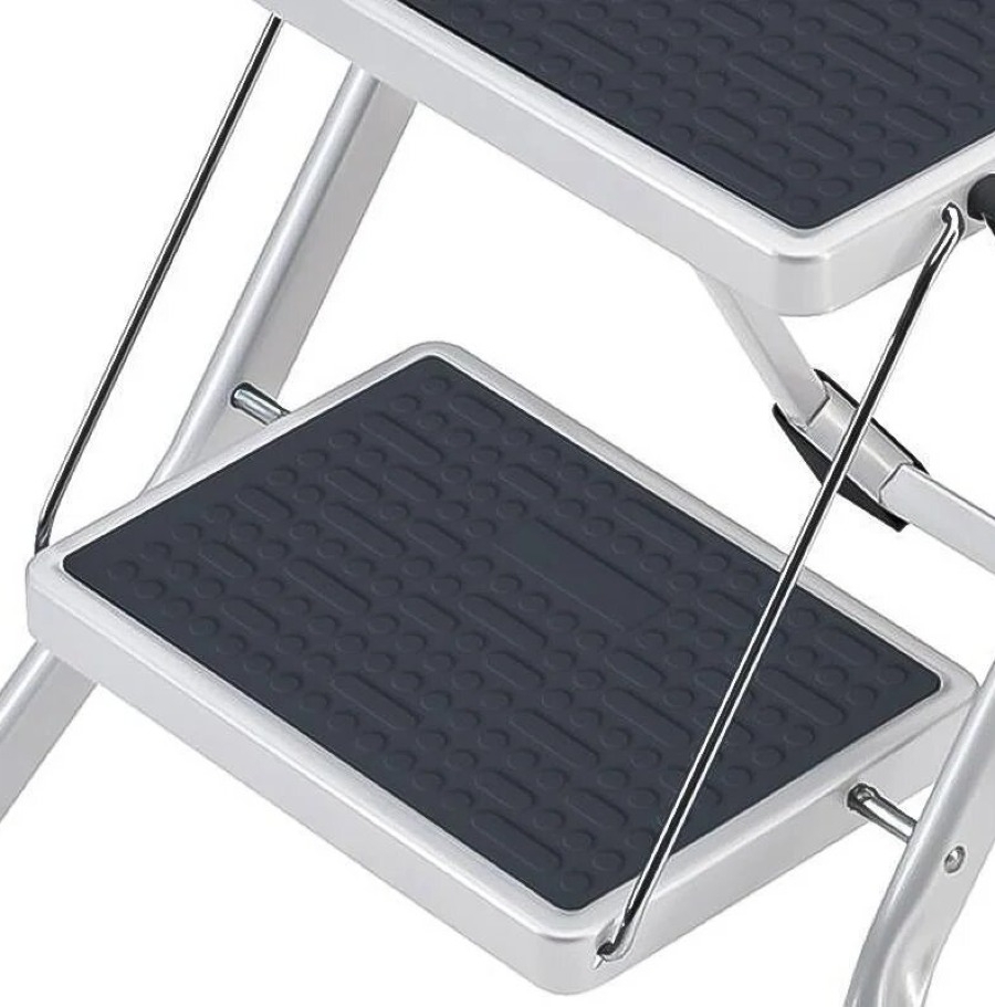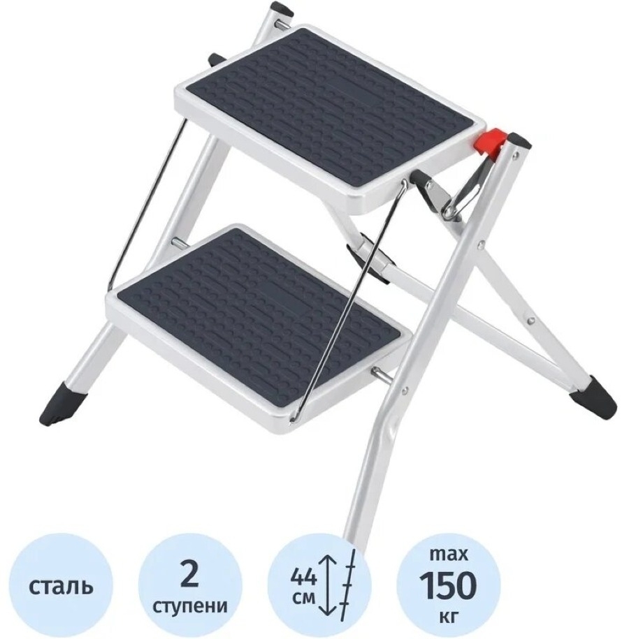 Стальная стремянка имеет 2 ступени размером 20×30 см. Высота рабочей площадки составляет 0.44 м, чего достаточно для выполнения большинства бытовых ремонтных работ.