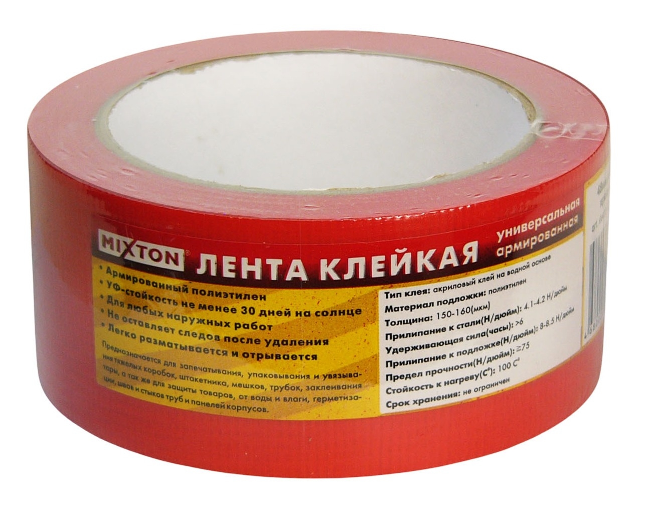 Универсальная клейкая лента MIXTON красного цвета выполнена из высококачественного полиэтилена и армирована тканевыми волокнами. Имеет высокую степерь прилипания к поверхности. Идеально подходит для наружных работ. Стойкость к УФ-лучам не менее 30 дней. Не осталяет следов на поверхности после удаления. Предназначается для запечатывания, упаковывания, увязывания тяжелых коробок, штакетника, мешков, трубок, заклеивания тары, а также для защиты товаров от влаги и воды, герметизации швов, стыков труб и панелей корпусов.