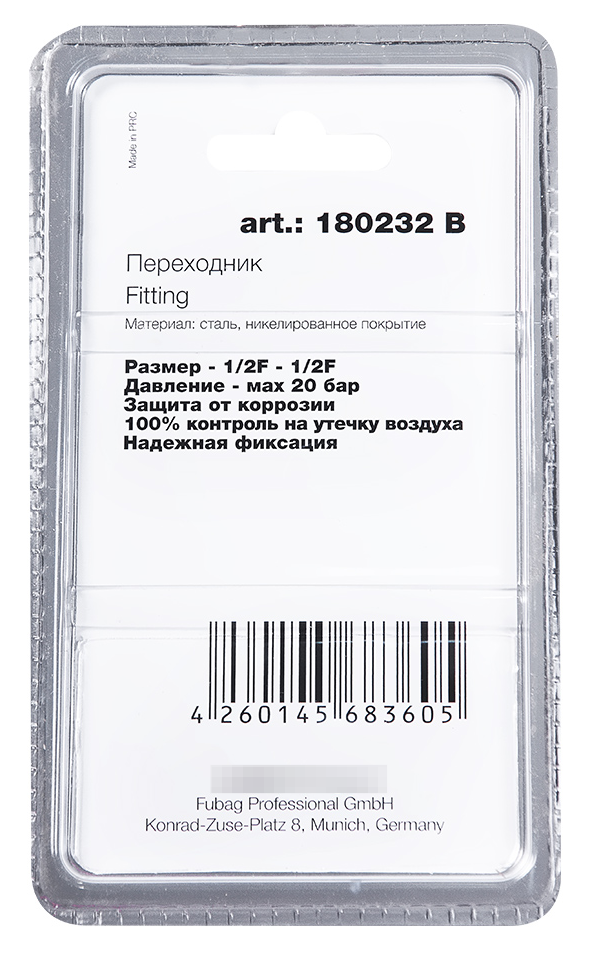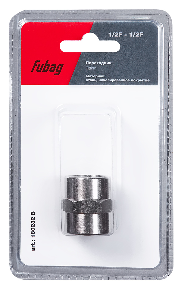 Переходник пневматический ½"F / ½"F Fubag (арт. 180232 B). Переходник для подключения пневмоинструмента. Переход с резьбы ½» (внутренняя) — ½» (внутренняя). Поставляется в блистере.