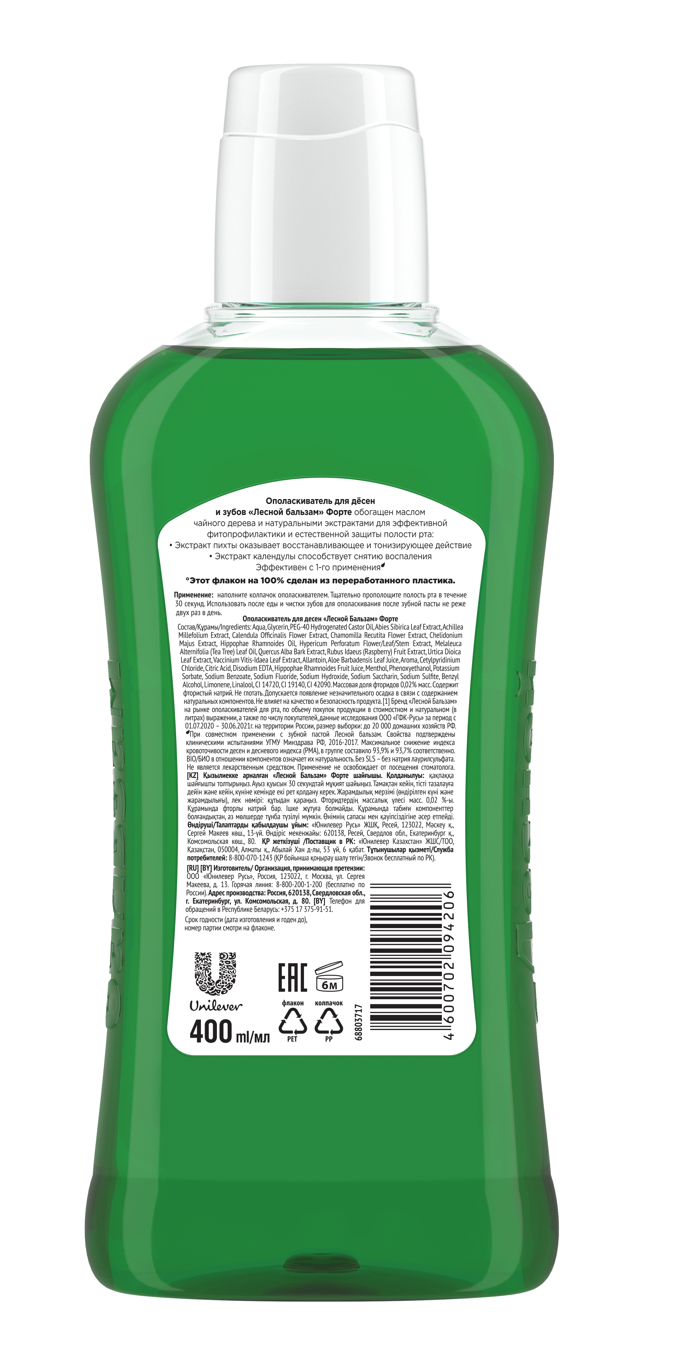 Продукт реализуется в удобном флаконе объемом 400 мл. Ополаскиватель для полости рта Лесной бальзам изготавливается из высококачественных и безопасных компонентов, не содержит парабенов и спирта. Рекомендован к ежедневному использованию после еды, до и после чистки зубов не реже двух раз.
