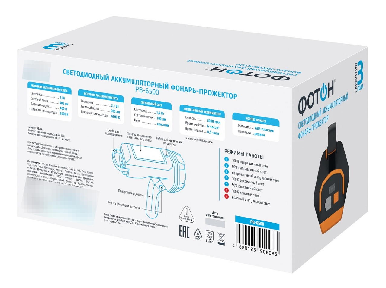 Основные характеристики светодиодного фонаря для кемпинга Фотон PB-6500: