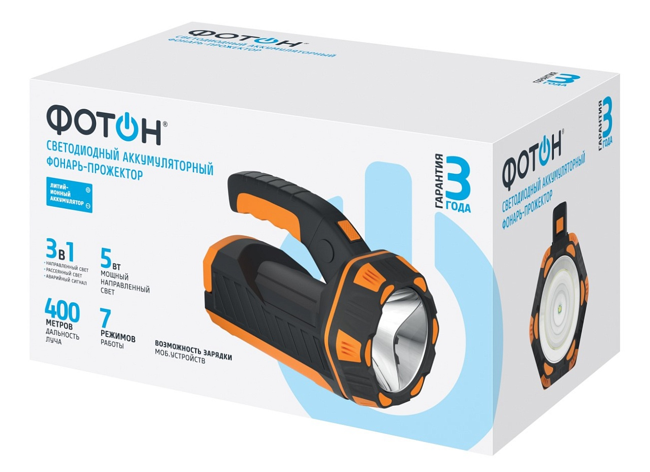 - Фонарь кемпинговый светодиодный Фотон PB-6500 прожектор аккумуляторный, зарядка от USB, 5Вт 400Лм 6500К, 7 режимов работы, 25910 - 1шт.