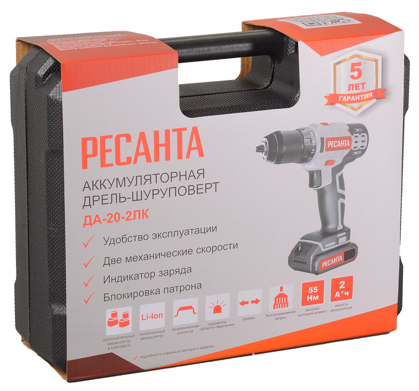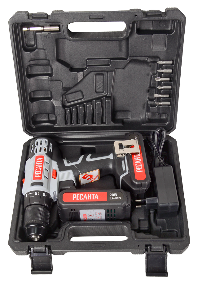 Дрель-шуруповерт аккумуляторная Ресанта ДА-20-2ЛК с 2 аккумуляторами, в кейсе, 20В, Li-Ion 2А/ч, 55Нм, 2 скорости / электроинструмент