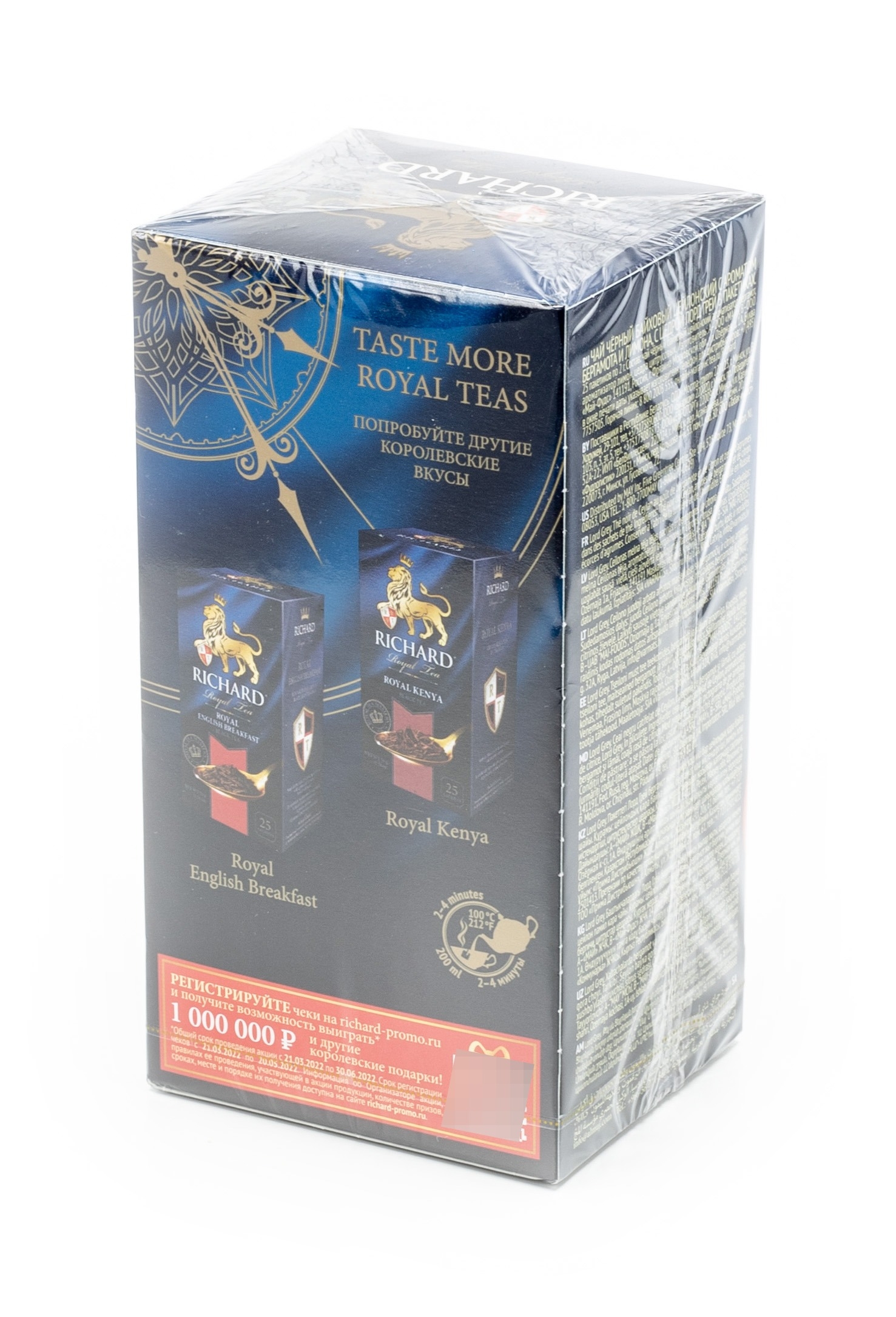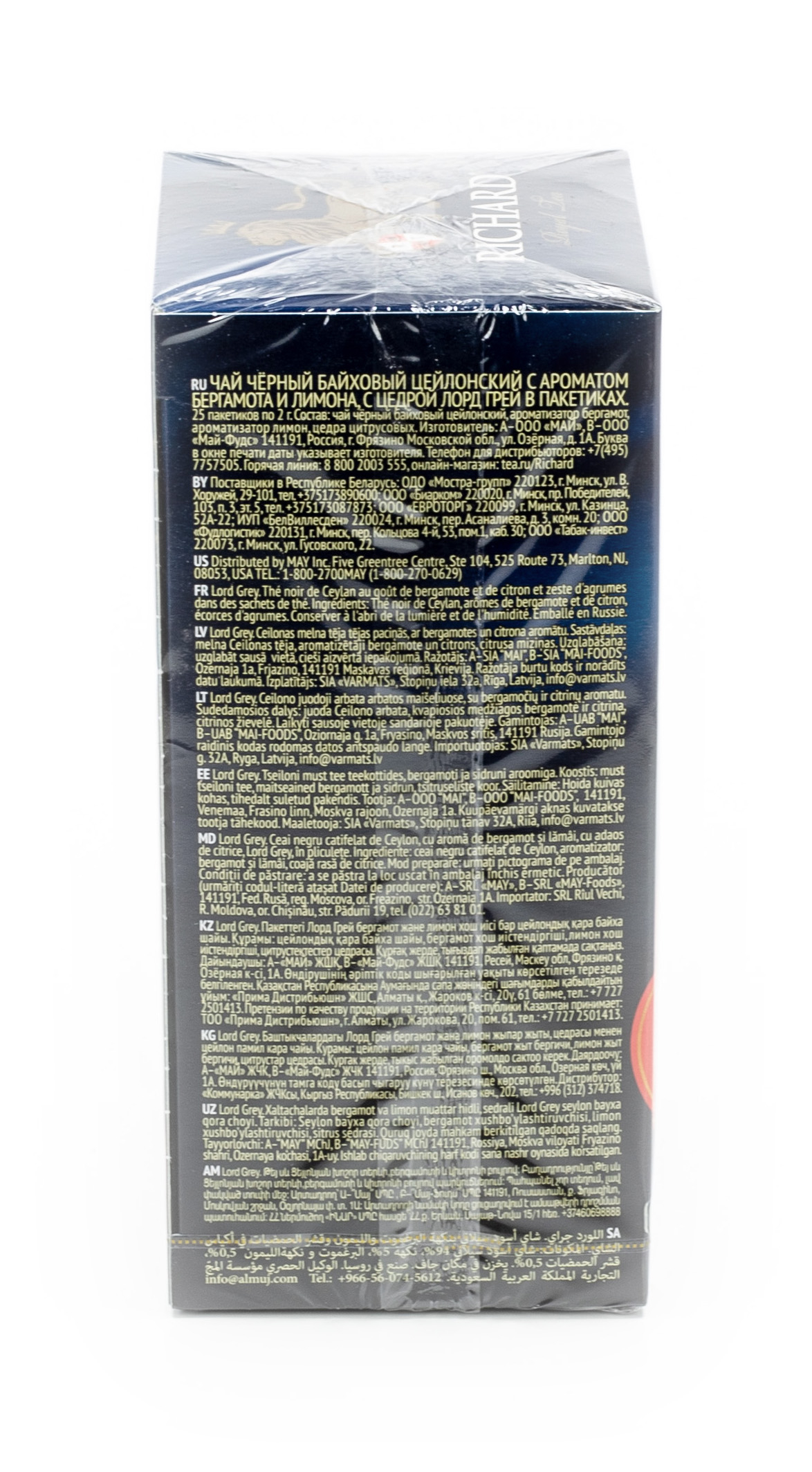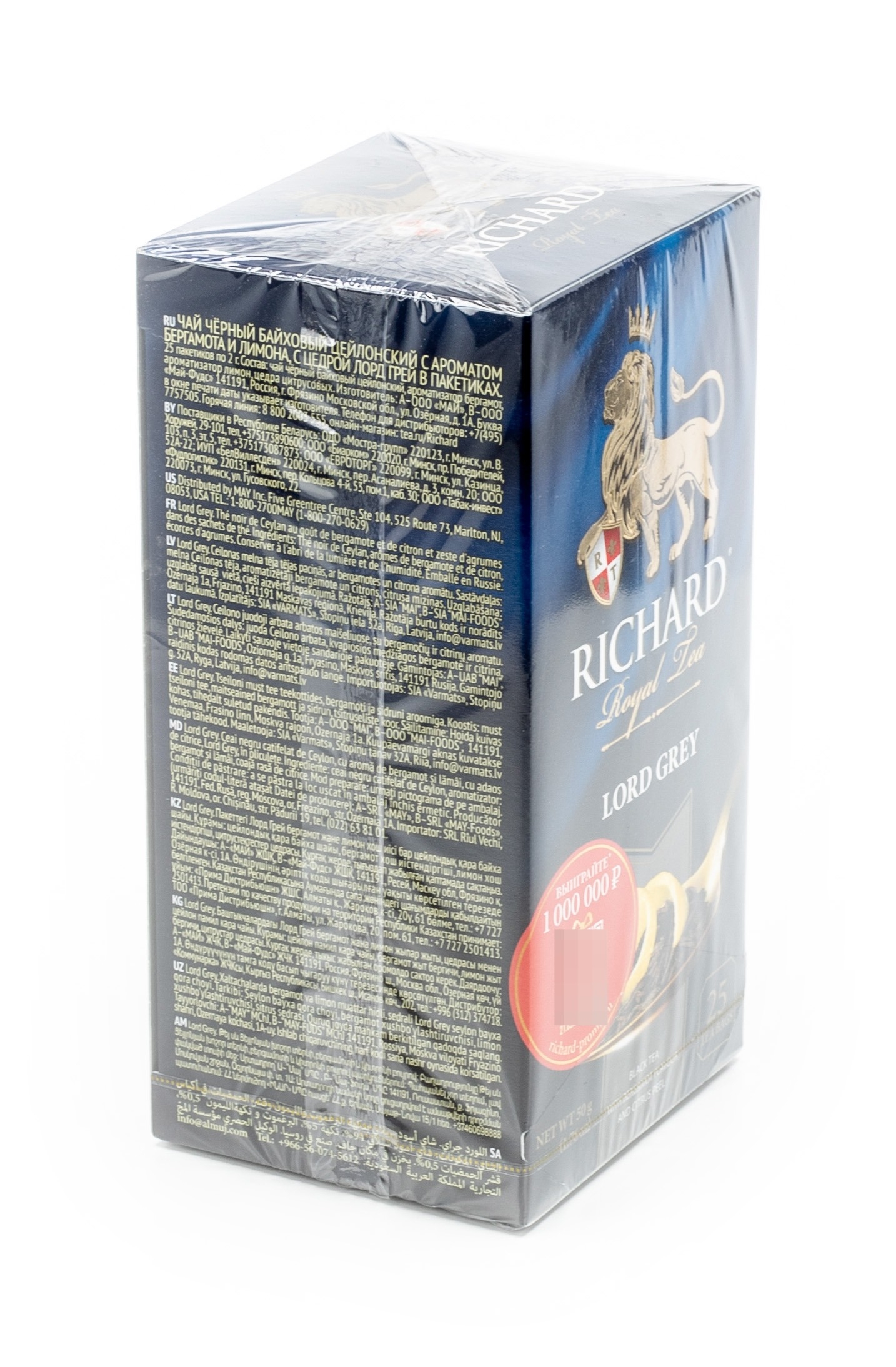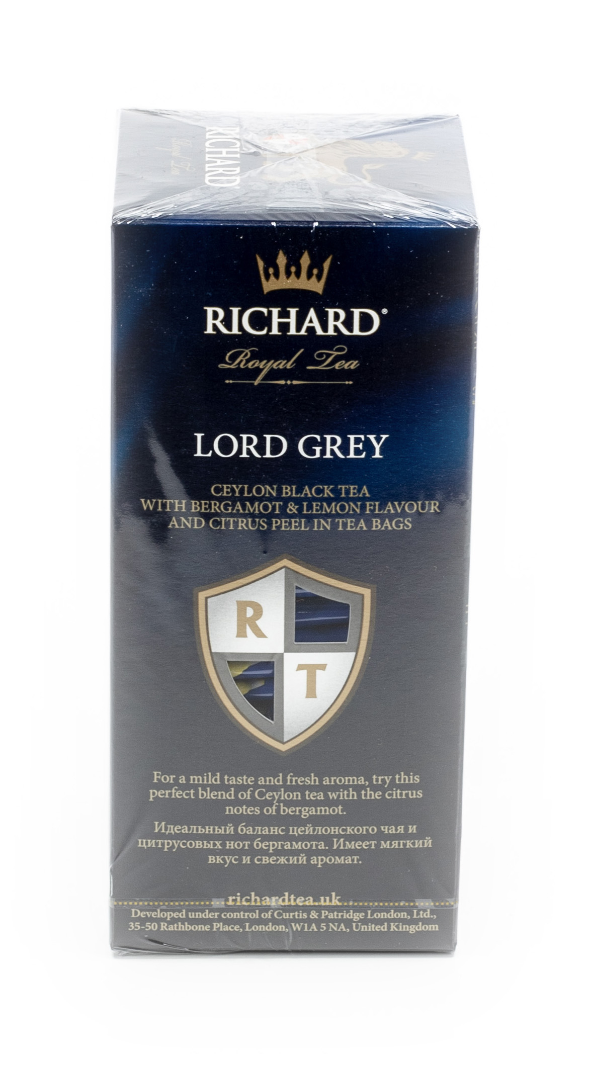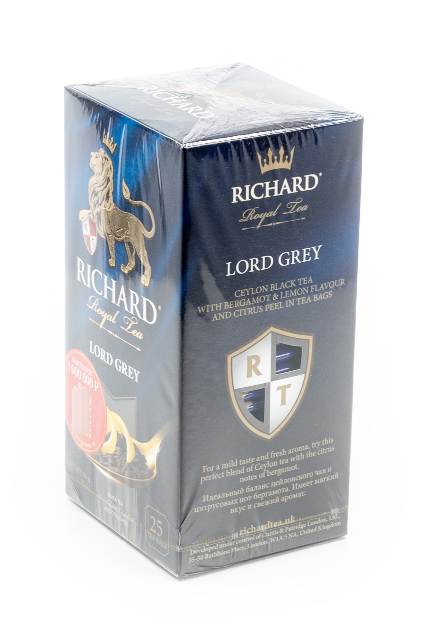 Продукт реализуется в картонной упаковке весом 50 г. Количество пакетиков — 25 шт. Чай Richard Lord Grey имеет насыщенный терпкий вкус. Время приготовления — 2 — 4 минуты.