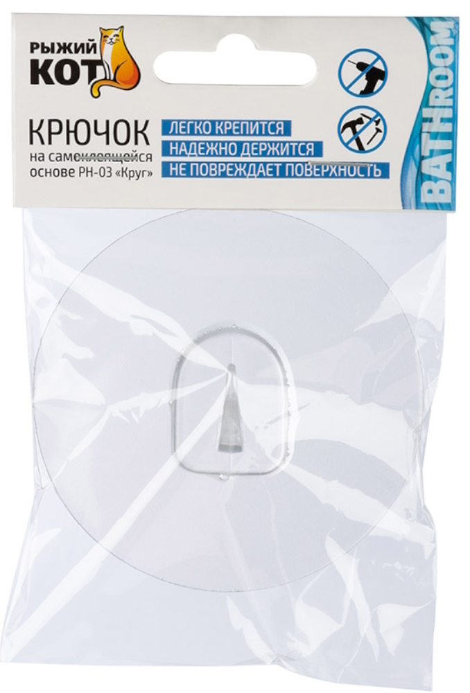 Прозрачный крючок на самоклеящейся основе Рыжий кот РН-03 подходит для: кухни, прихожей и ванной комнаты. Не боится влаги. Размещается на любой гладкой ровной поверхности: стекло, кафель, металл, деревянная мебель (шкафы). Для крепления изделия не требуется сверления, шурупов и гвоздей, тем самым не портятся стены. Выдерживает нагрузку до 10кг.