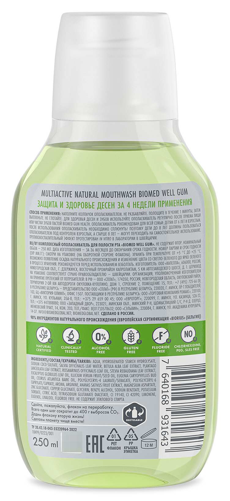 Не содержит: фтор, триклозан, хлогексидин, парабены, сахаринат, спирт, SLES, PEG и красители.