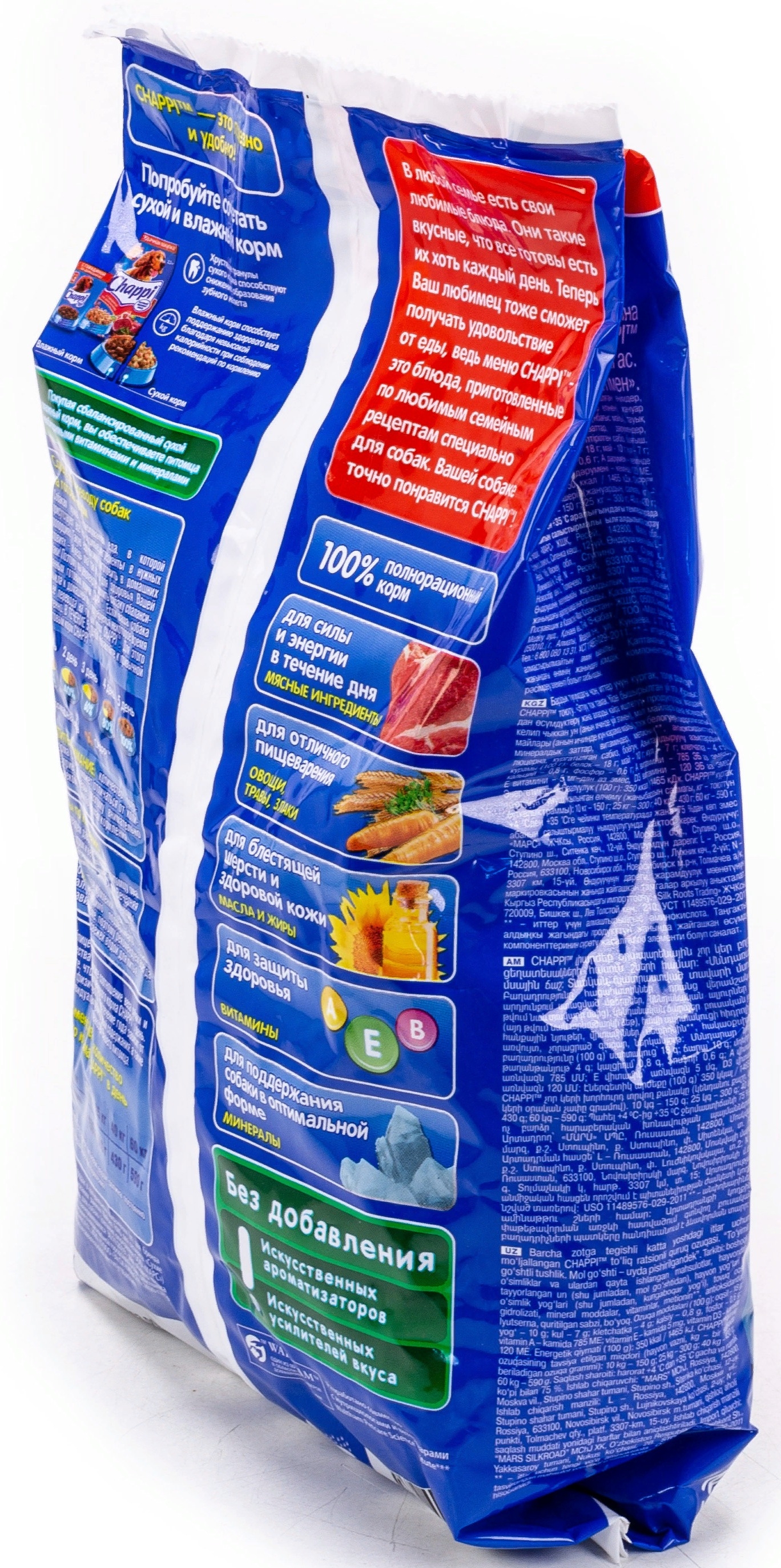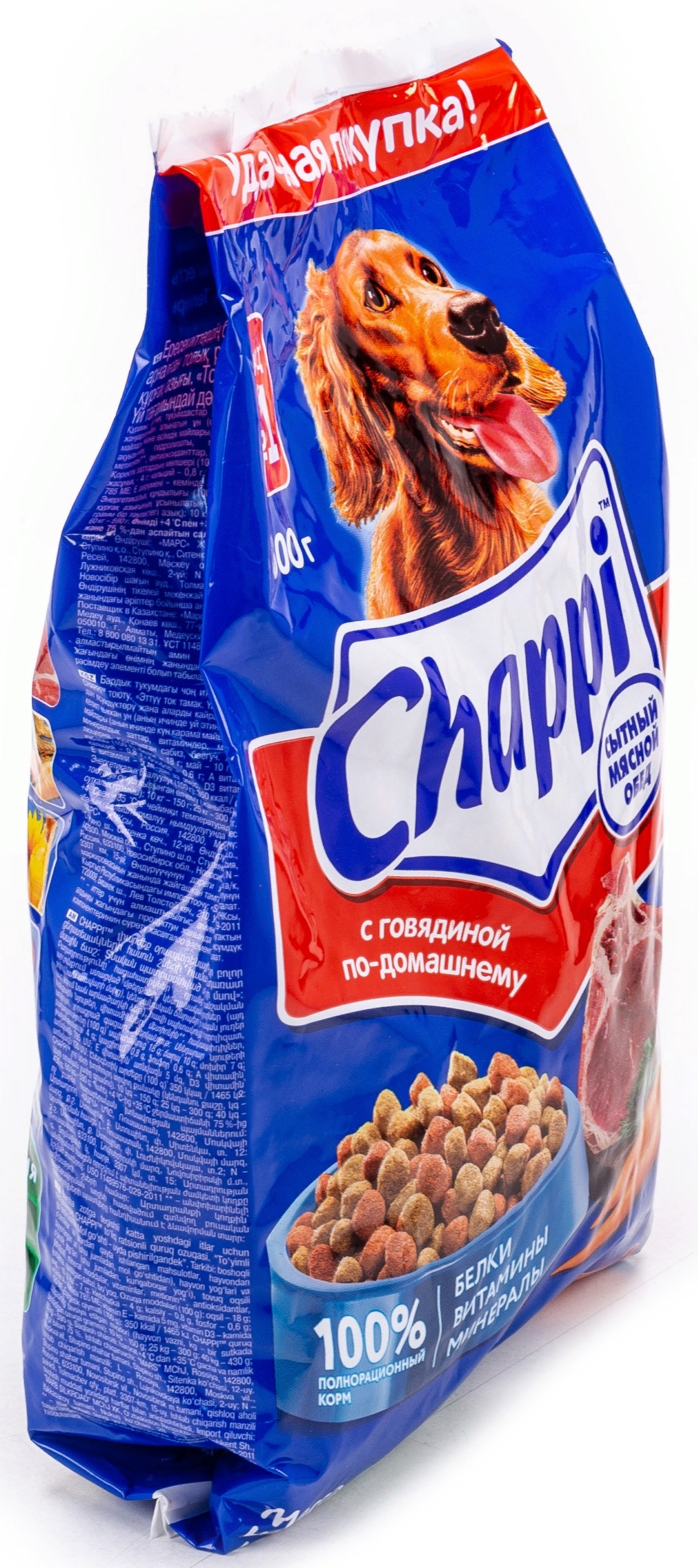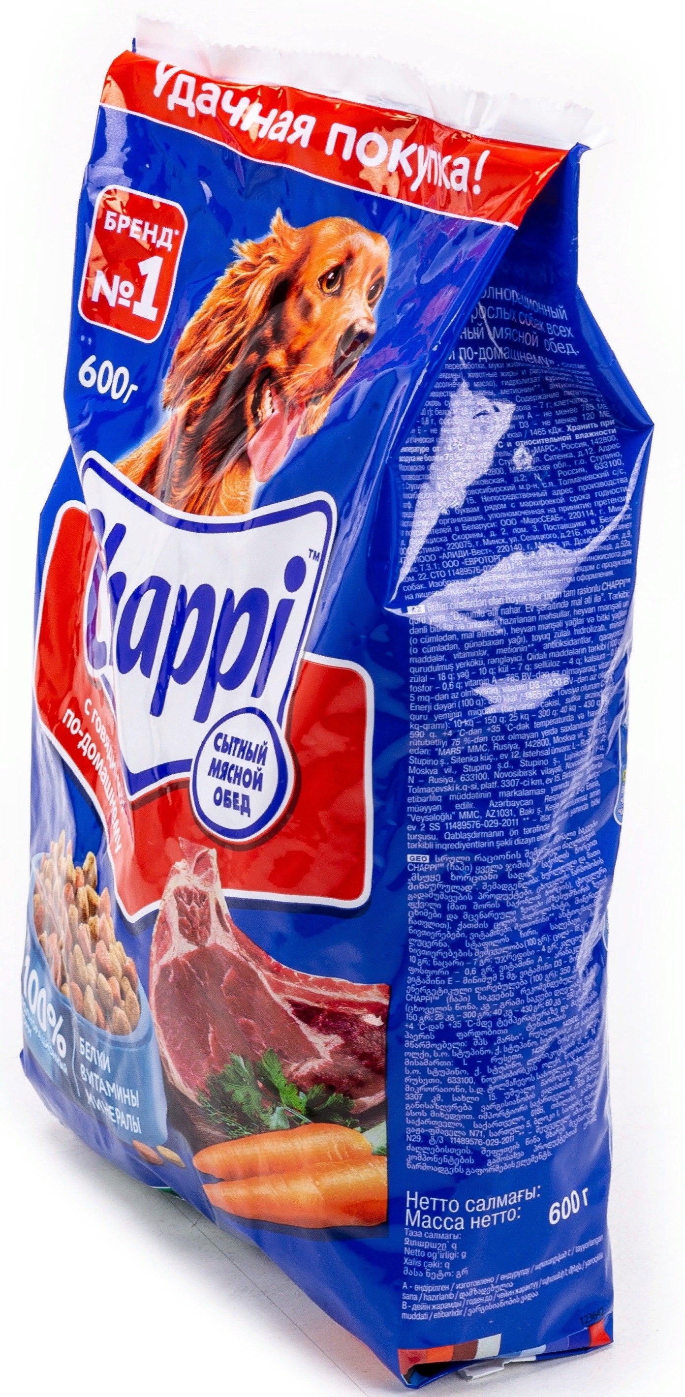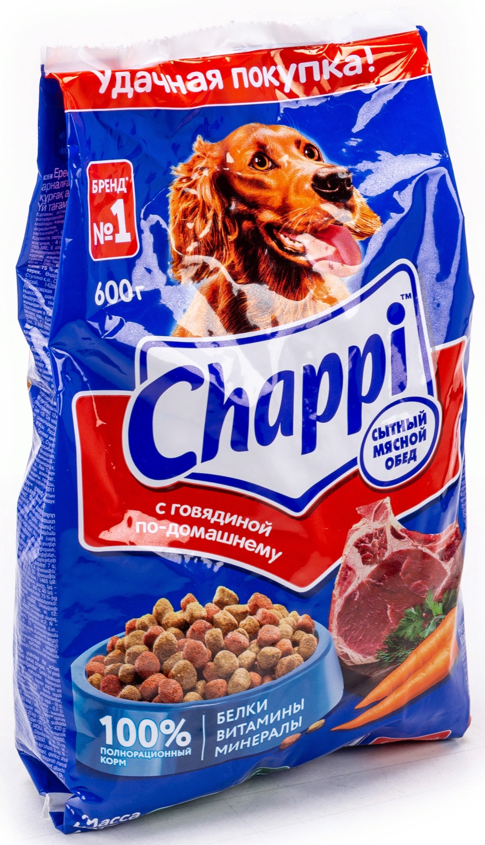 В Chappi есть все необходимые для собаки белки, жиры и углеводы, а также полезные витамины и минералы. Готовый рацион Chappi содержит натуральные и полезные ингредиенты — приправу из овощей и трав — морковь и люцерну.