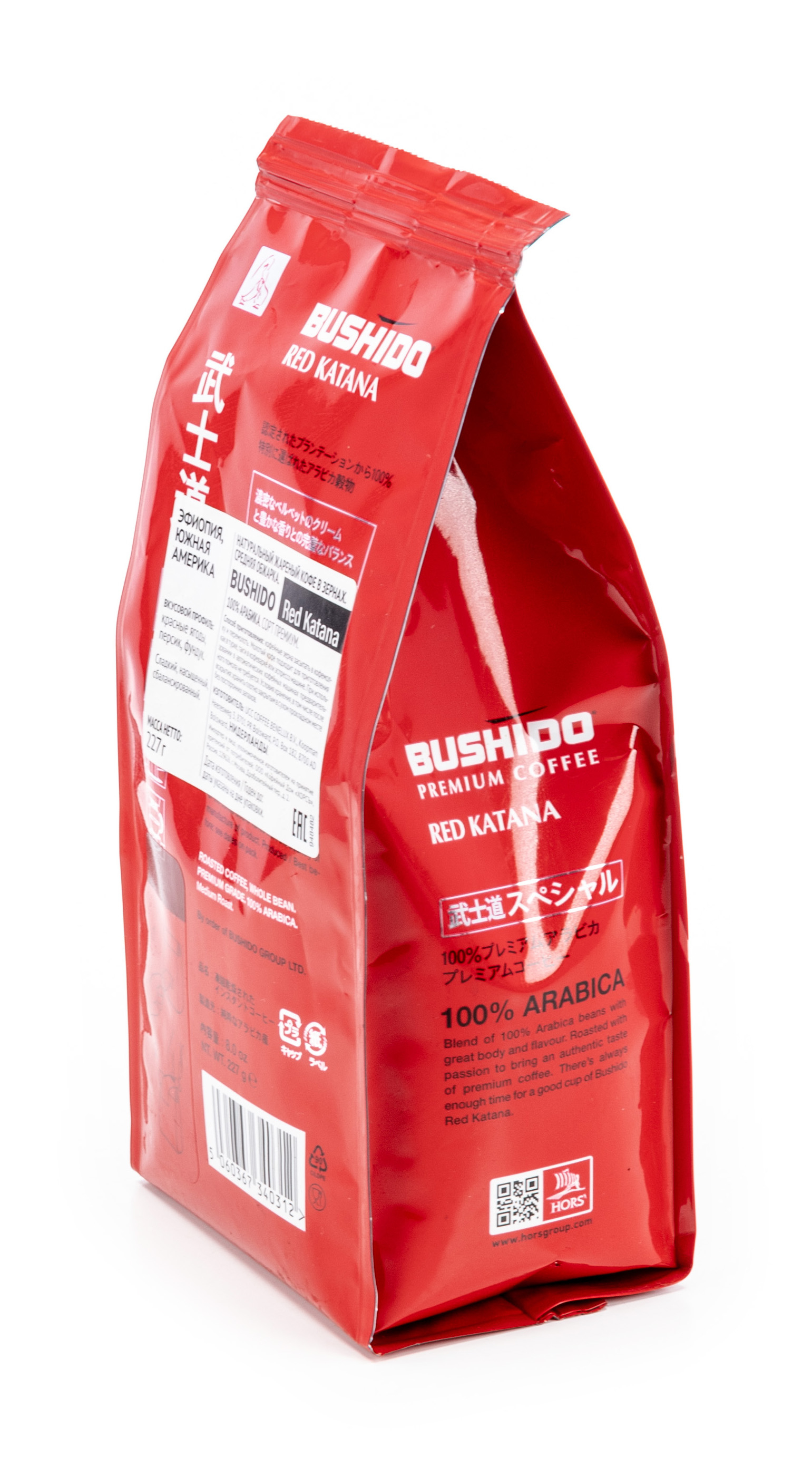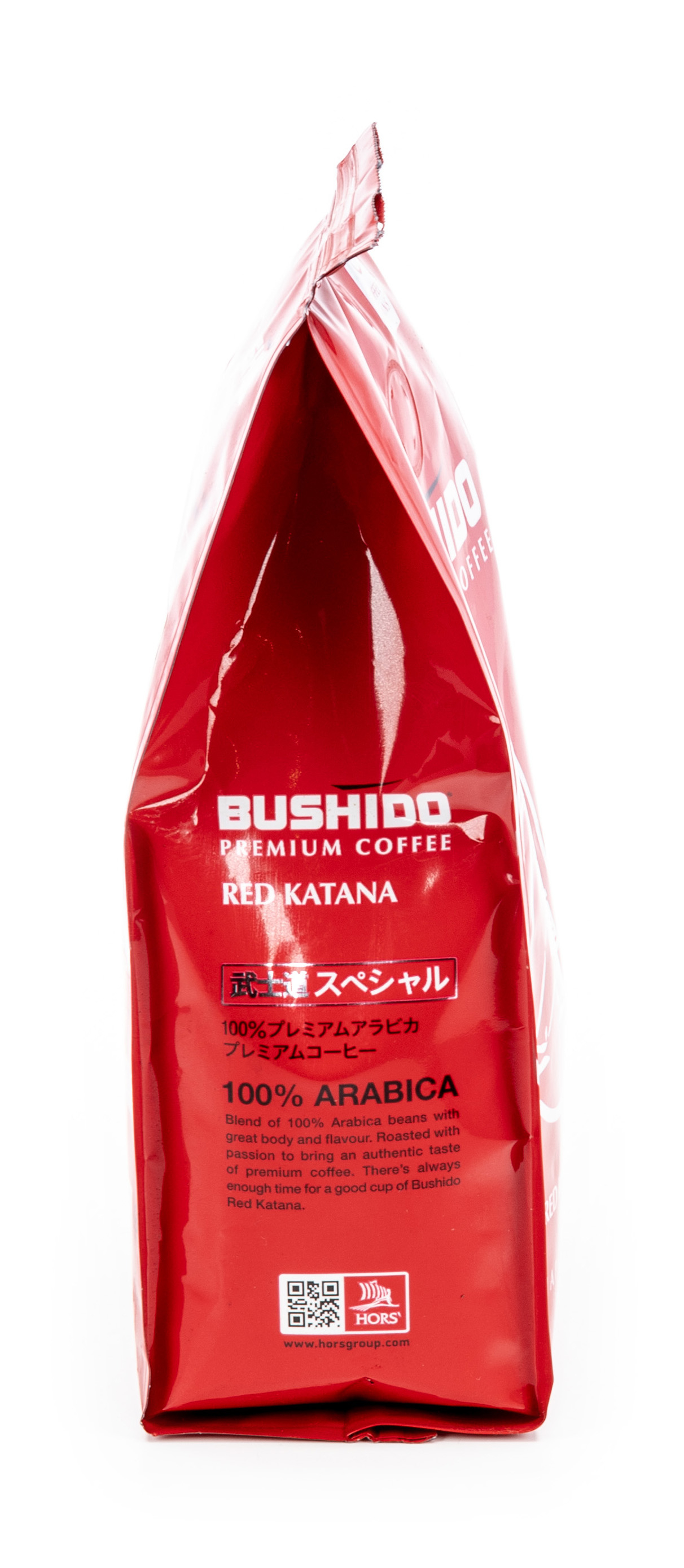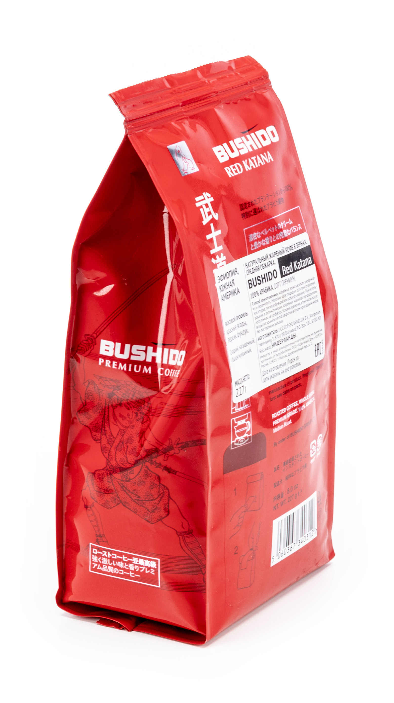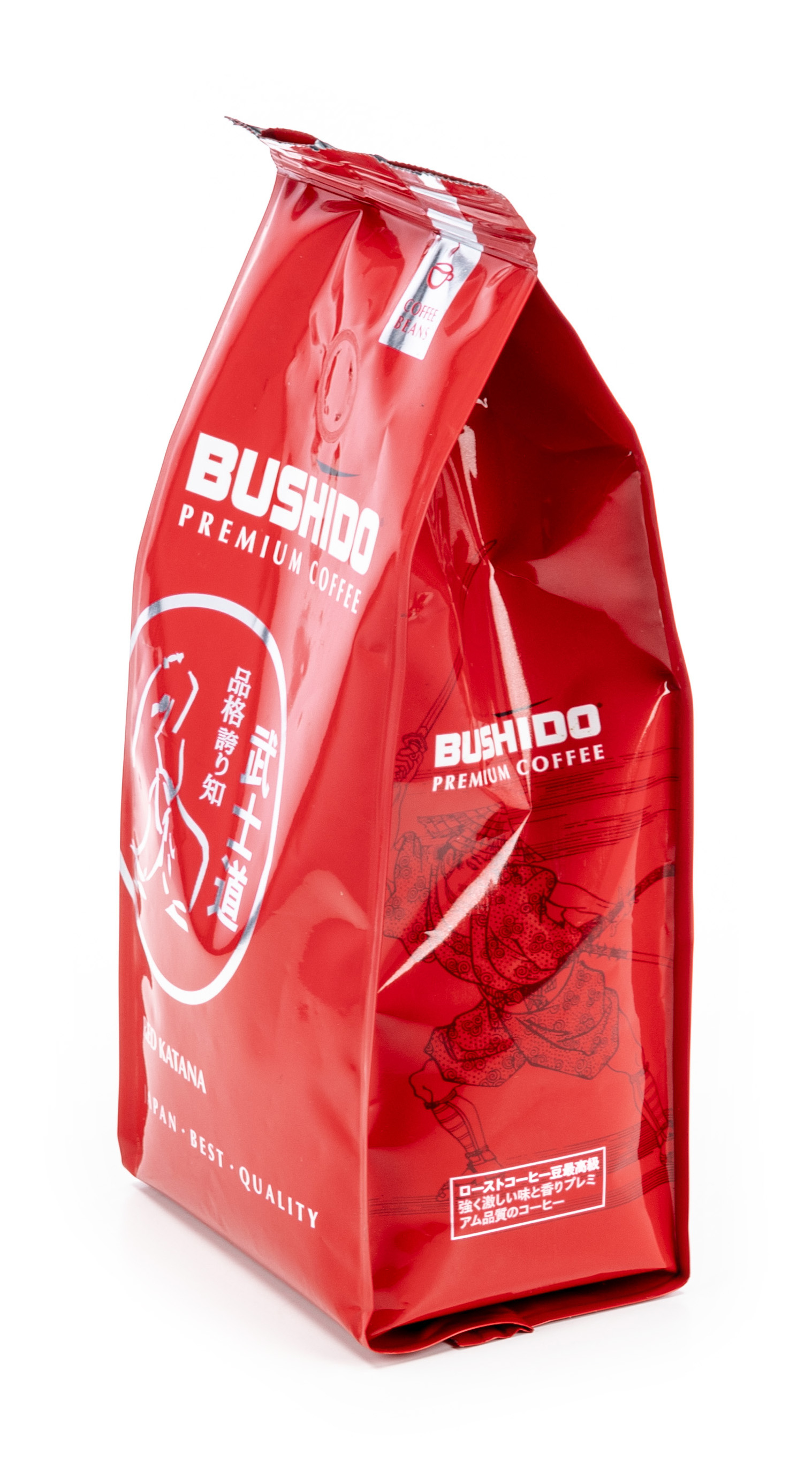 Bushido Red Katana (Ред Катана) — зерновой премиум-класса состоит на 100% Арабики, выращенной в Эфиопии, Латинской Америке. Аромат представлен нотками красных ягод, сладостью, персиковым оттенком. Сырье собирают вручную, применяют мытье, сушат под солнечными лучами в горах. Разновидность обжарки одна из наиболее распространенных — городская.