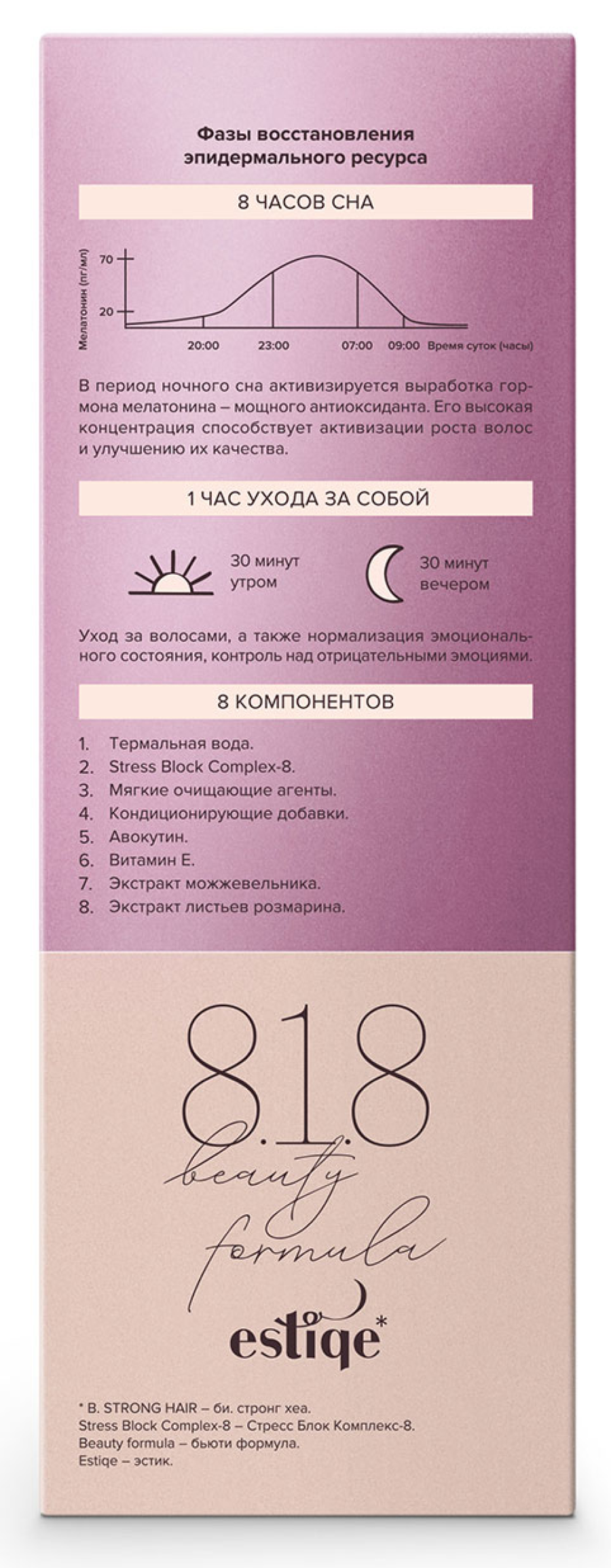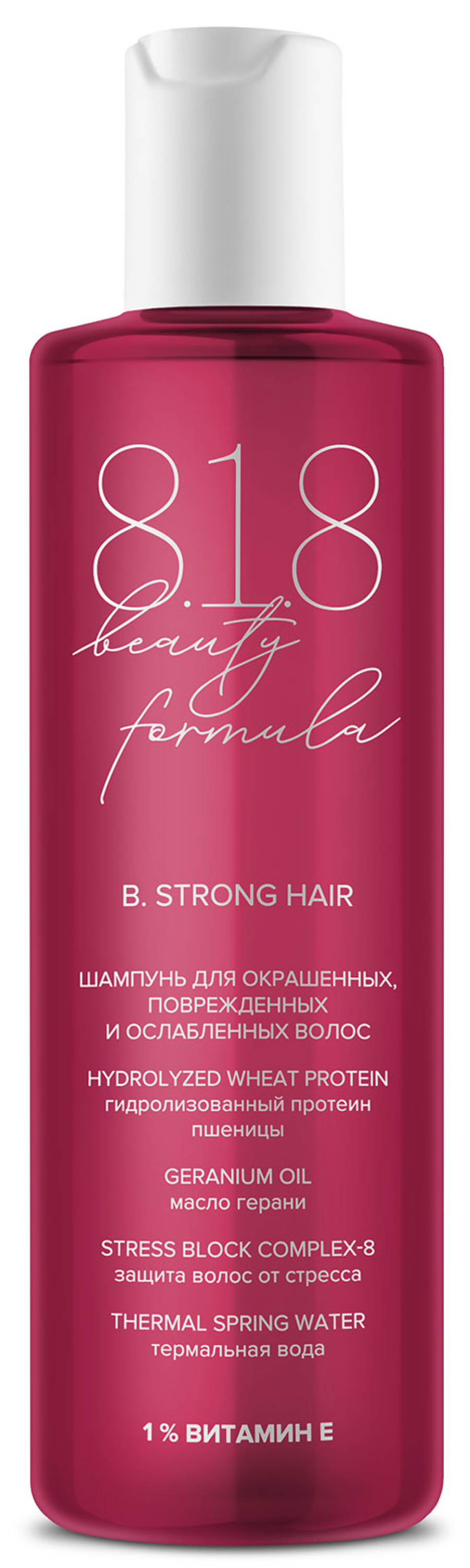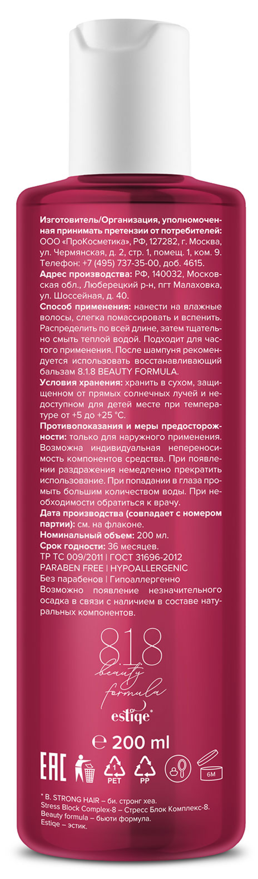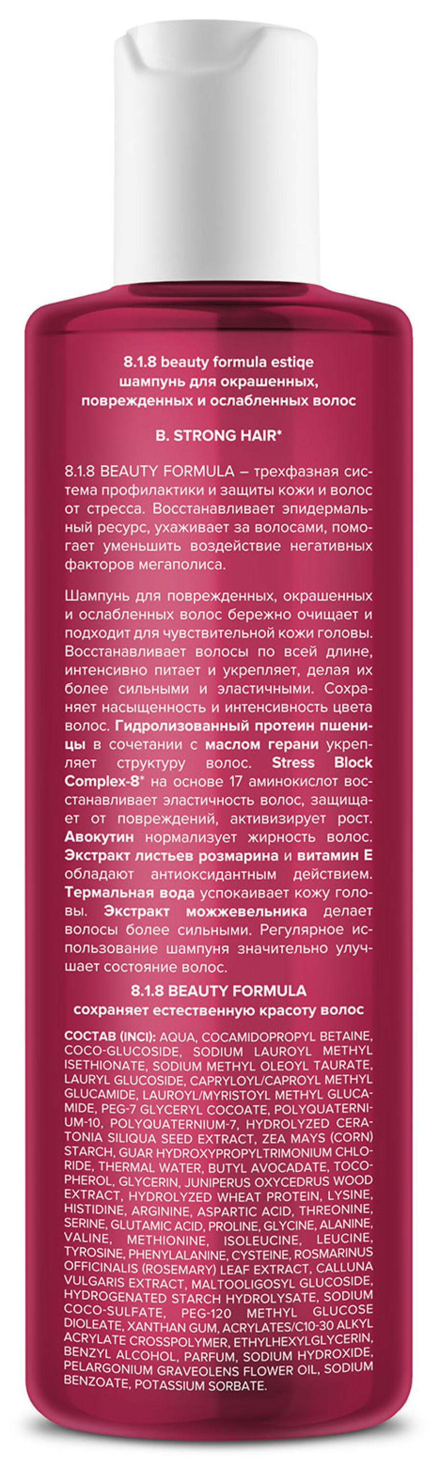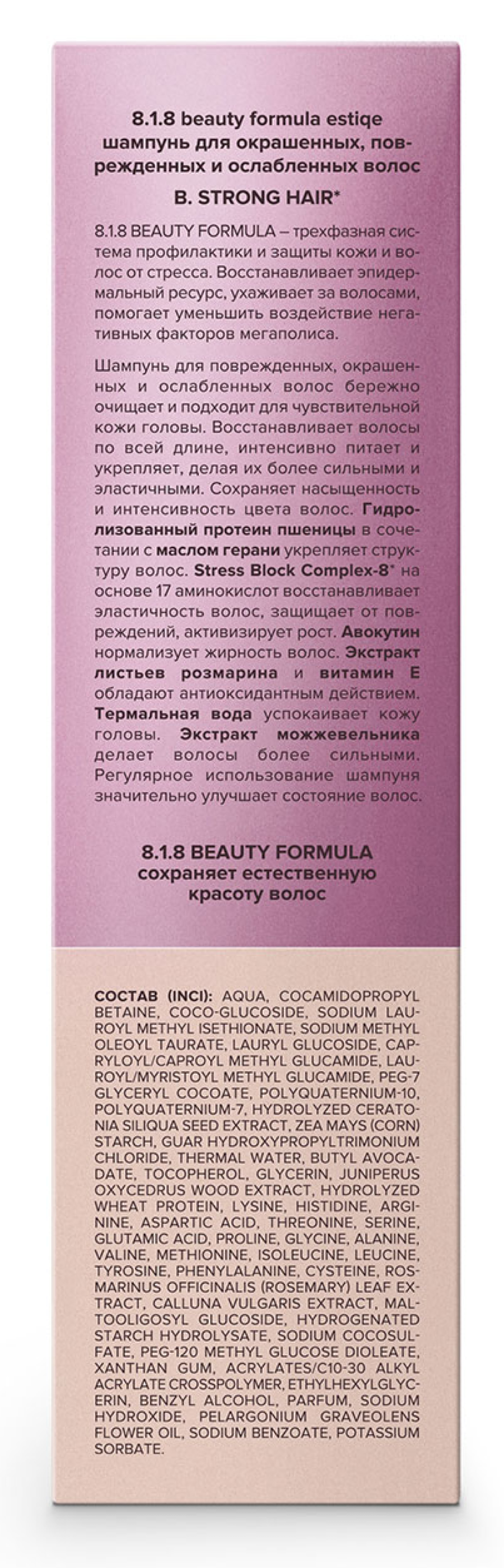 8.1.8 Beauty formula Estiqe шампунь для волос — базовое средство для ухода за волосами, которое эффективно очищает кожу головы, не пересушивая ее. Шампунь для окрашенных, поврежденных и ослабленных волос с натуральными экстрактами образует мягкую пену, бережно ухаживая за волосами, выравнивая и восстанавливая их структуру. Компоненты моющего средства увлажняют волосы и делают их мягкими, блестящими и послушными.
