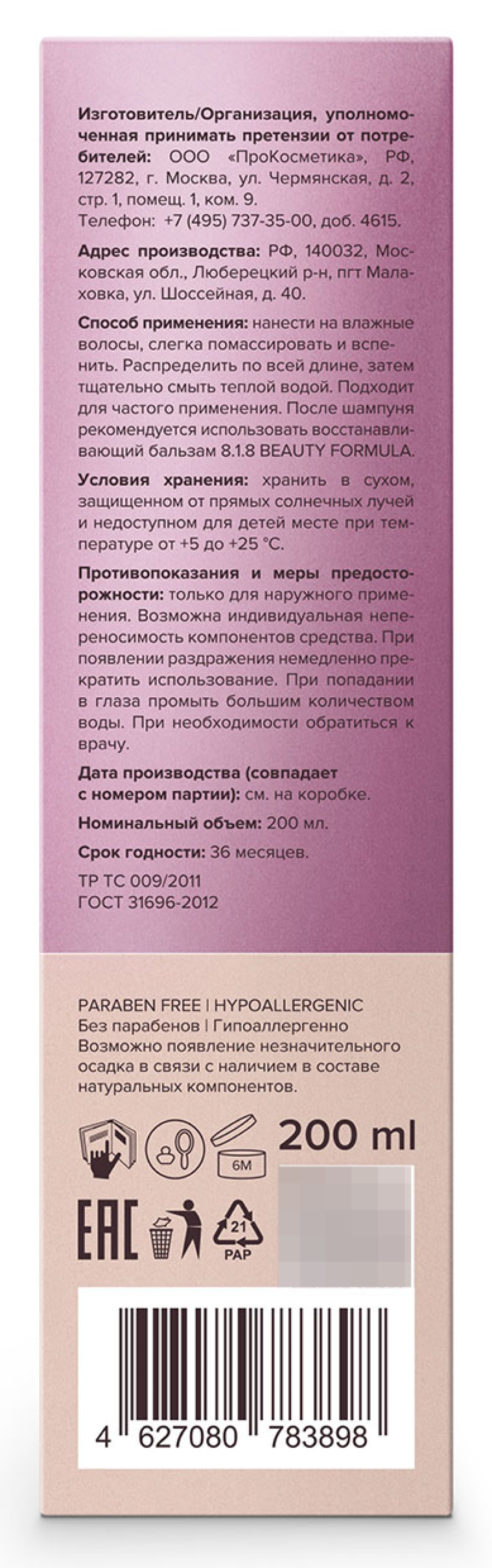 Легкий приятный аромат шампуня 8.1.8 Beauty formula Estiqe будет сопровождать вас и создаст ощущение свежести на весь день.