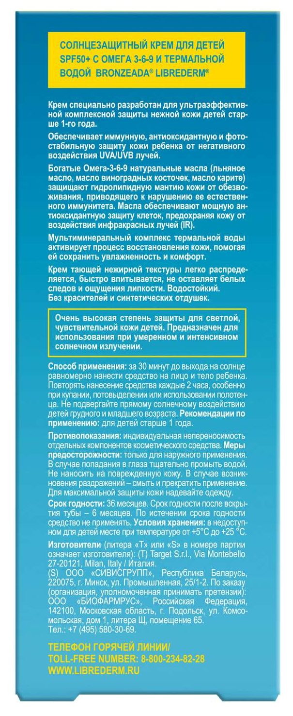 Librederm Bronzeada Kids 1+ крем солнцезащитный для тела рекомендован для ежедневного ухода за кожей, в том числе за очень сухой и склонной к шелушению, а также в качестве вспомогательного средства при солнечных и термических ожогах.
