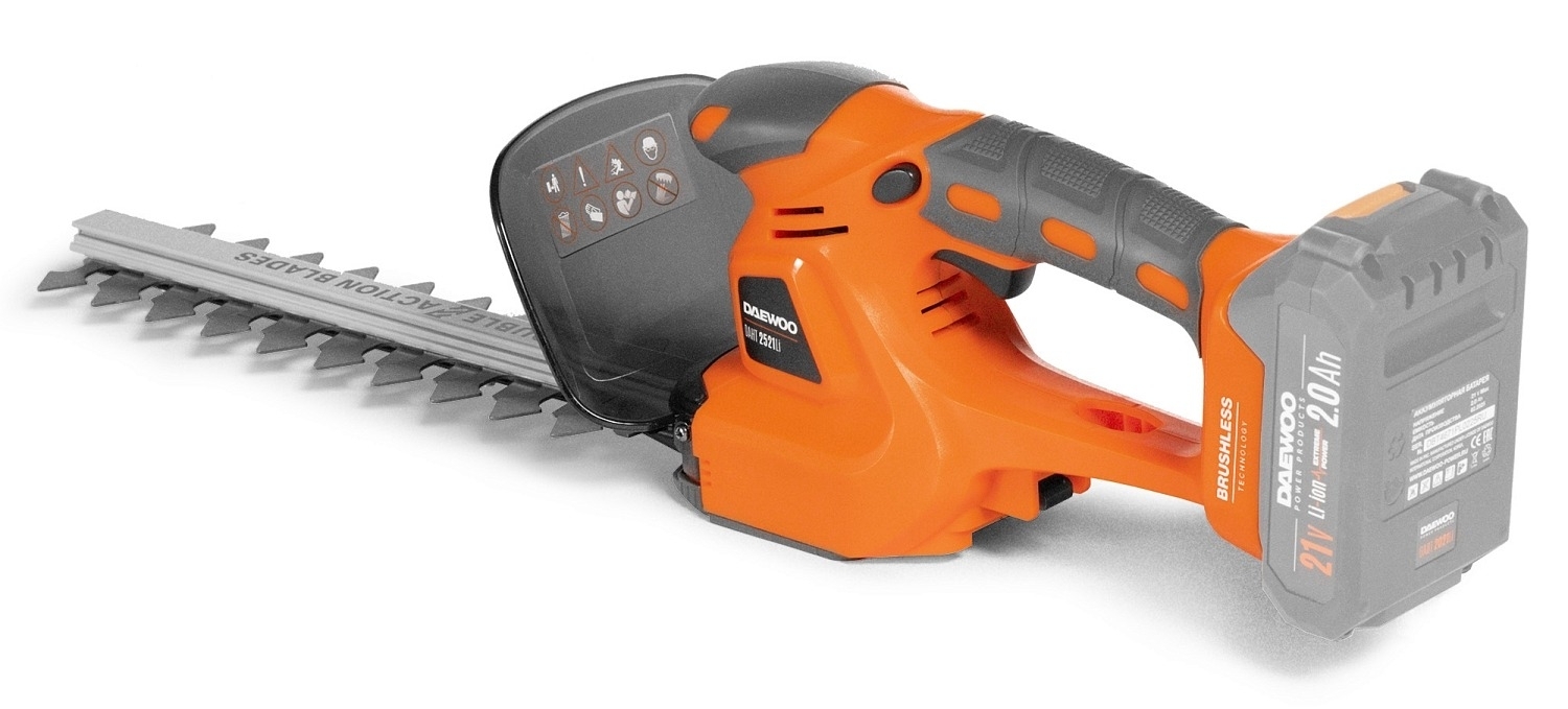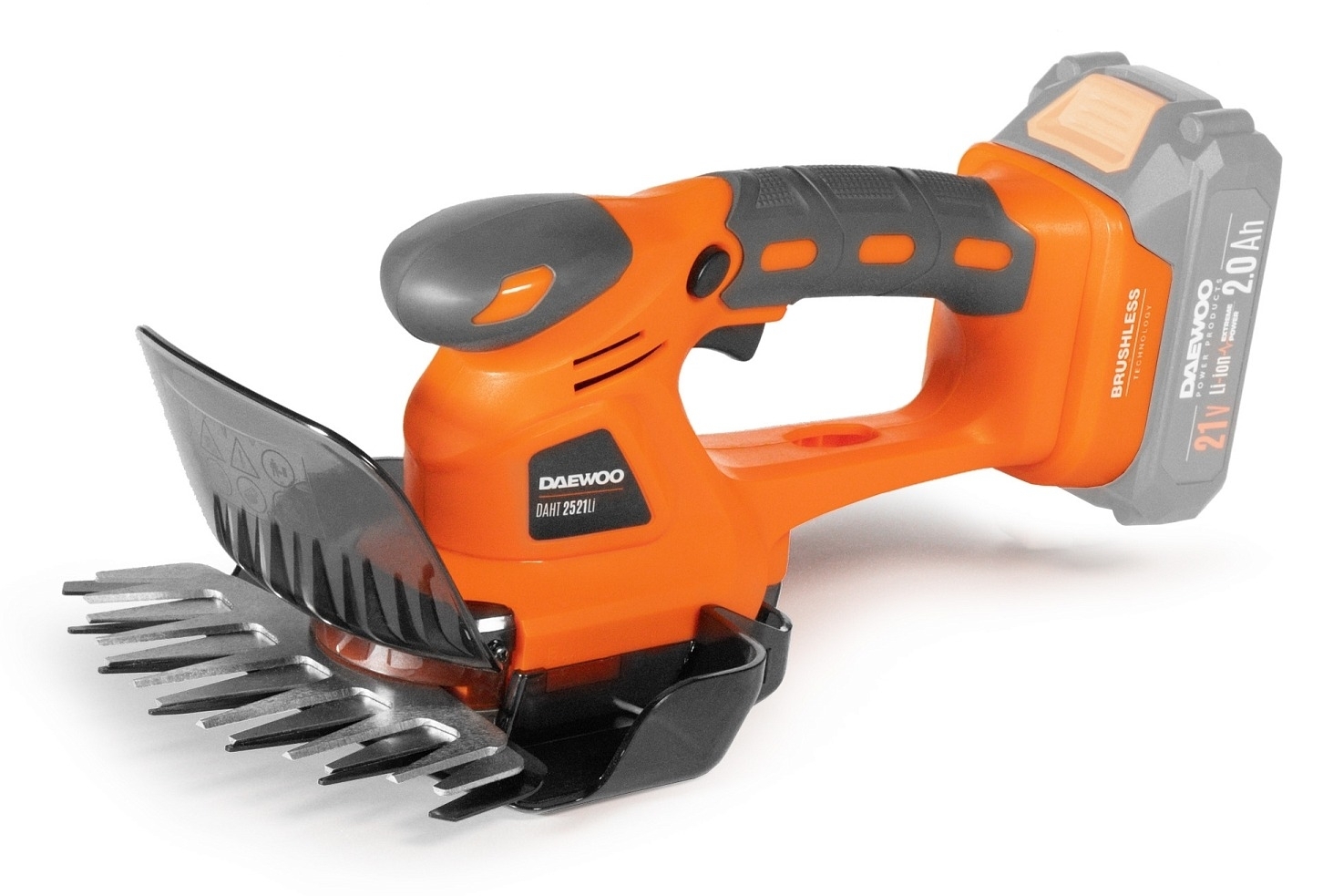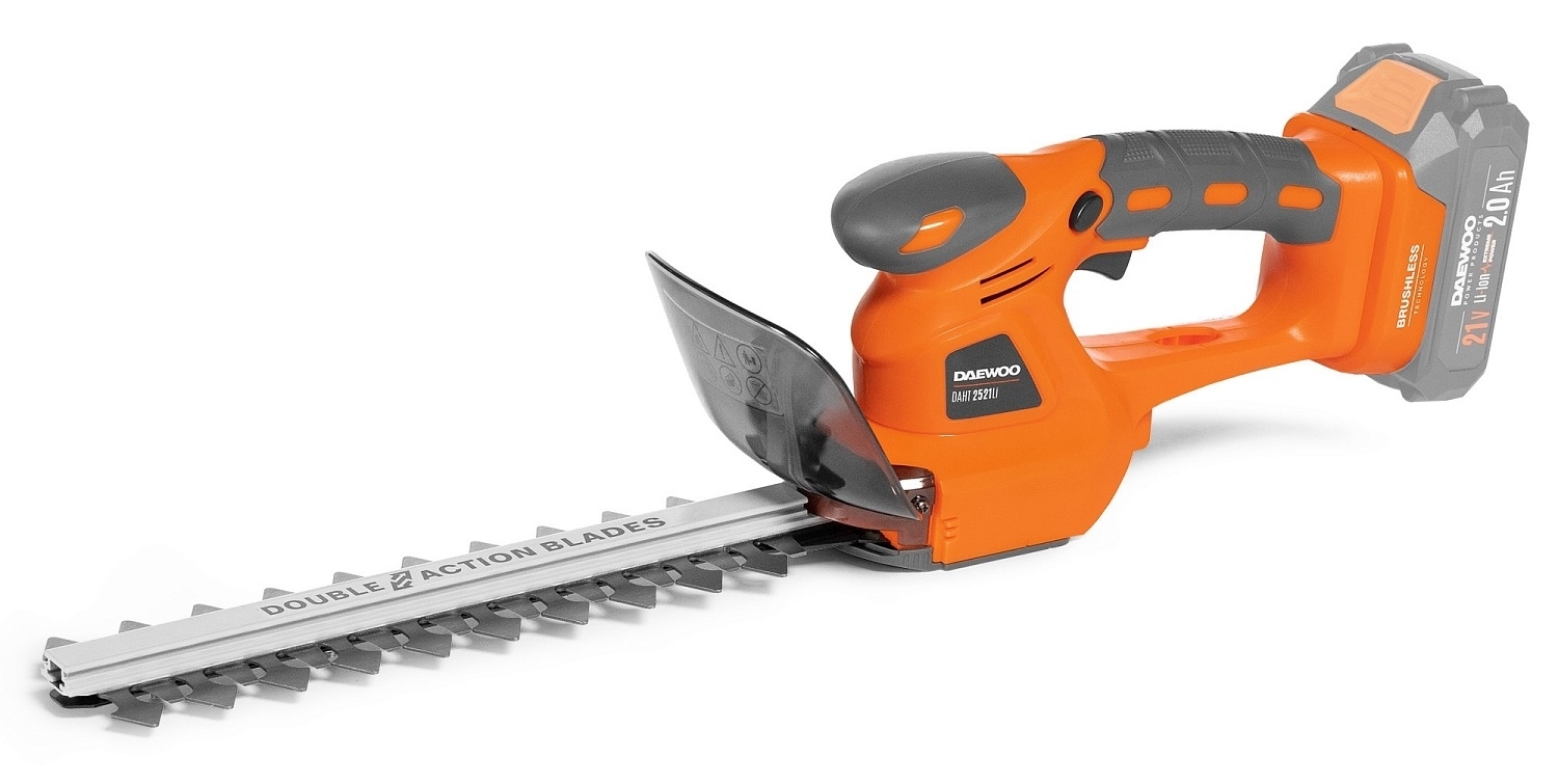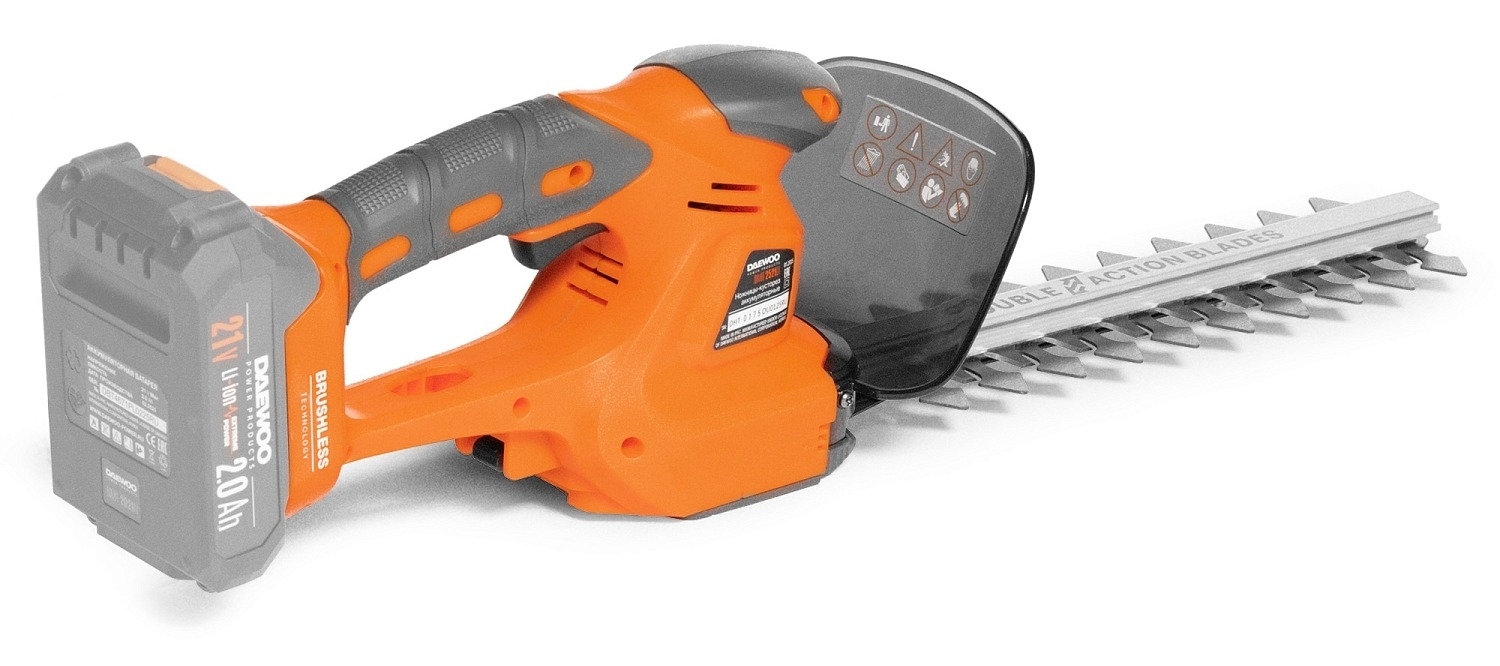 Кусторез аккумуляторный DAEWOO / Дэу DAHT 2521Li, двусторонний, оранжевый, Li-ion, 2Ач, диаметр реза 8мм, ширина скашивания 16см, 21В, 1.46кг / садовый инструмент