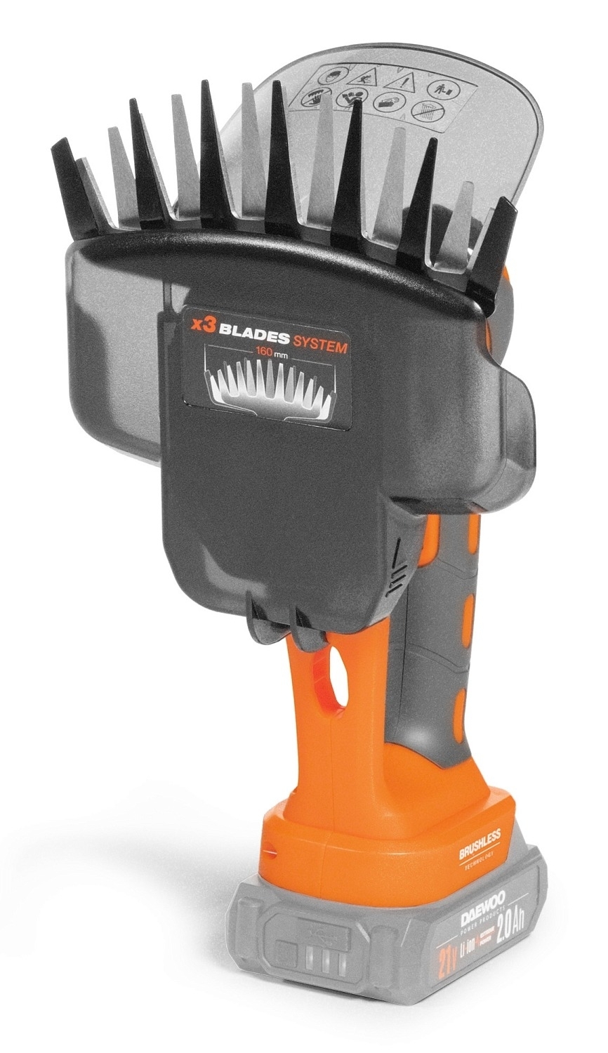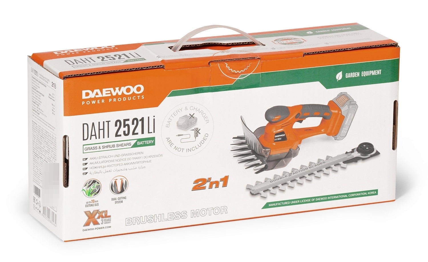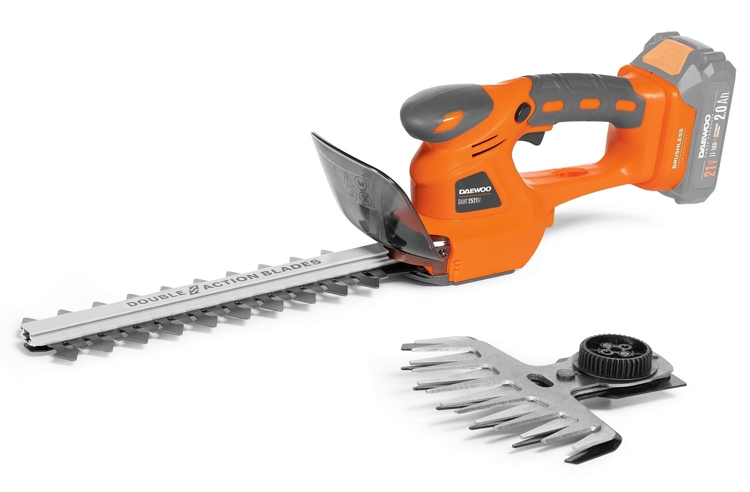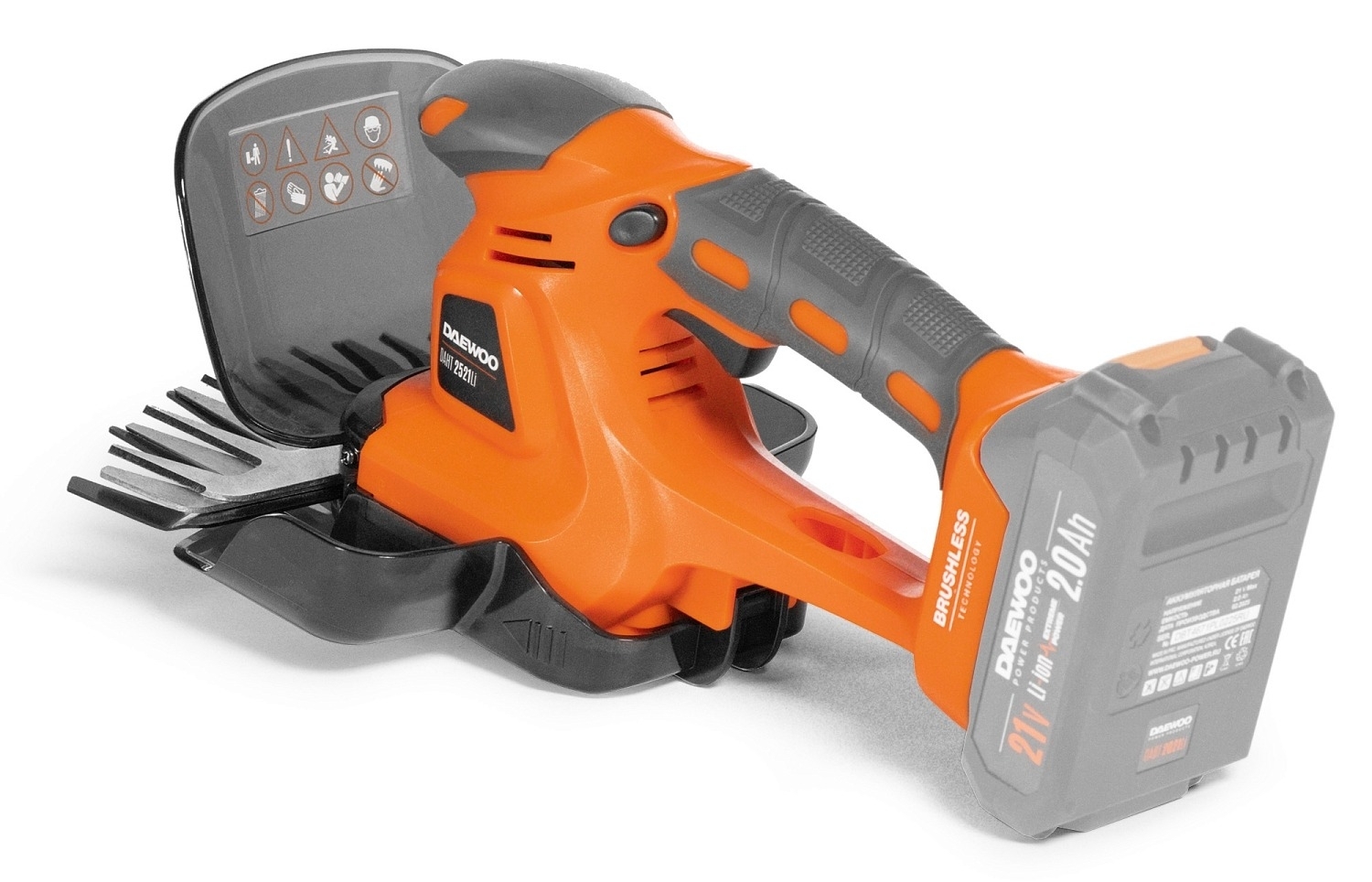 Кусторез аккумуляторный DAEWOO / Дэу DAHT 2521Li, двусторонний, оранжевый, Li-ion, 2Ач, диаметр реза 8мм, ширина скашивания 16см, 21В, 1.46кг / садовый инструмент