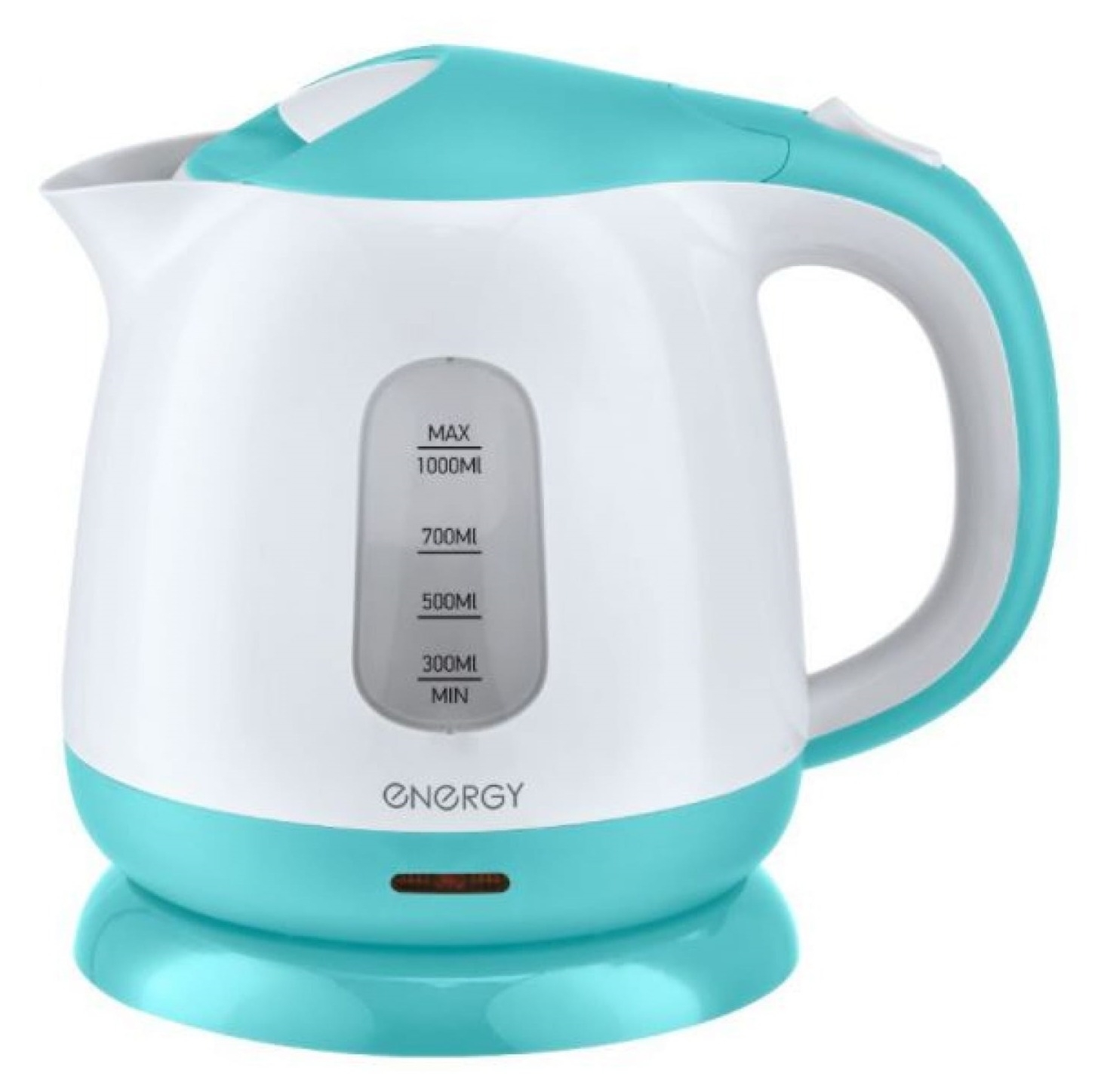 Чайник E-275 пластик 1 л, диск бело-бирюзовый ENERGY 164095. Компактный чайник, предназначенный для кипячения воды дома, в офисе, в загородном доме, на даче. Корпус изделия и подставка изготовлены из высококачественного пластика. Закрытый нагревательный элемент выполнен из нержавеющей стали. Для удобства при использовании имеется шкала уровня воды и световой индикатор работы. Благодаря беспроводному соединению изделие может поворачиваться на подставке на 360°. Предусмотрена система защиты, реализованная в функциях: блокировка включения без воды и автовыключение.
