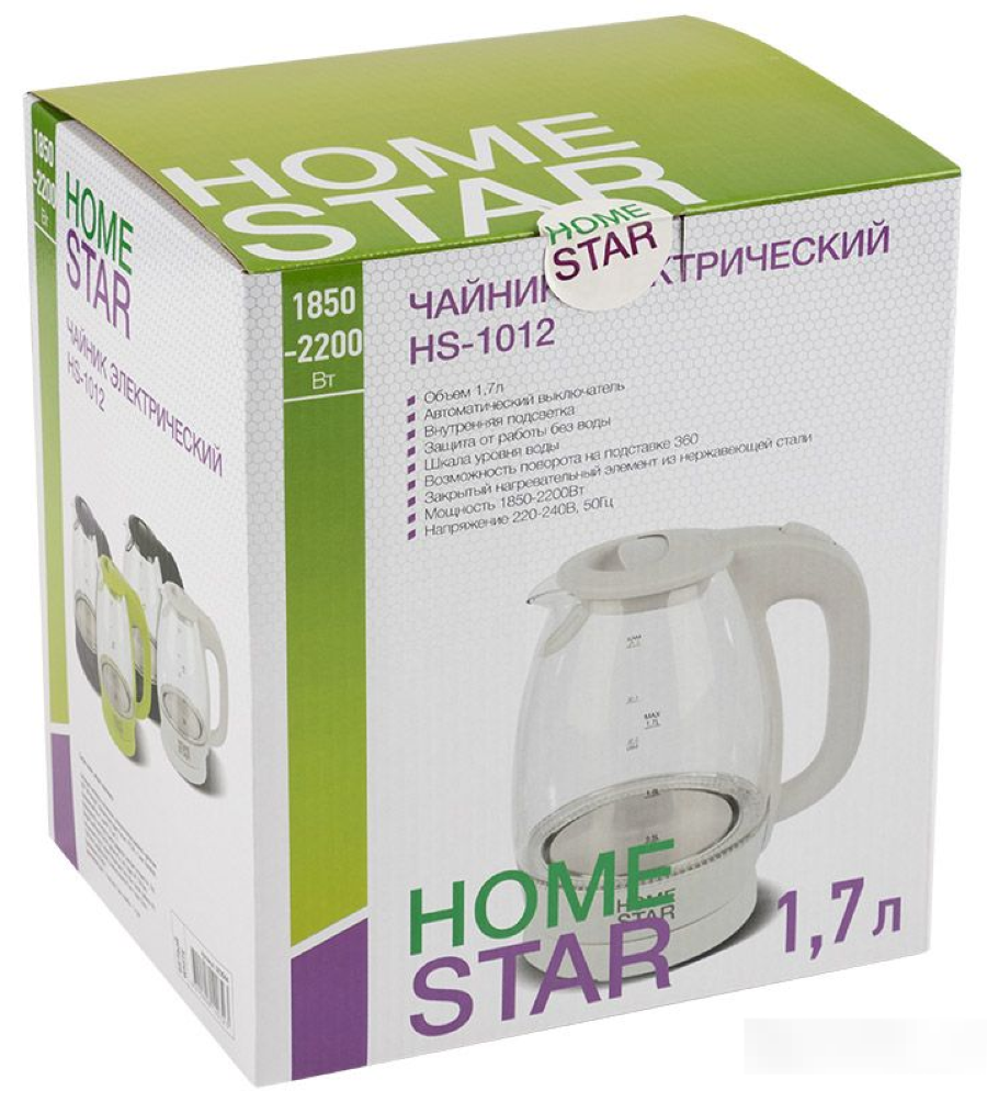 Чайник HomeStar HS-1012 сочетает в себе современный дизайн и передовые технологии. Он выполнен в корпусе из термостойкого стекла. Цвет — белый. Объем — 1.7 л. Мощность — 1850-2200 Вт. Длина шнура — 73 см.