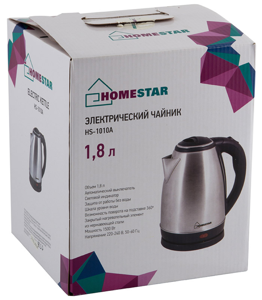 Чайник HomeStar HS-1010A сочетает в себе современный дизайн и передовые технологии. Он выполнен в корпусе из нержавеющей стали. Цвет — серебристый. Объем — 1.8 л. Мощность — 1500 Вт. Длина шнура — 60 см.