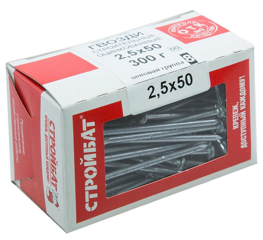Гвозди строительные оцинкованные Стройбат 2.5х50мм (0.3кг) 2611016. Применение: для временного монтажа деревянных конструкций с применением мягких строительных материалов. Гвозди строительные оцинкованные применяются в неразборных узлах, а также во время проведения наружных работ. Материал изготовления: сталь. Головка: плоская, рифленая. Покрытие: белый цинк.