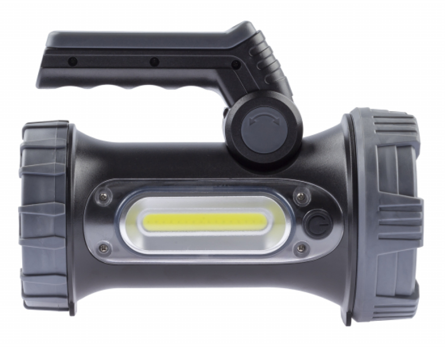 Аккумуляторный фонарь удобно брать с собой. Он имеет рельефную ручку, хорошо лежит в руке. Конструкция ручки позволяет регулировать направление света, а также трансформируется в подставку.