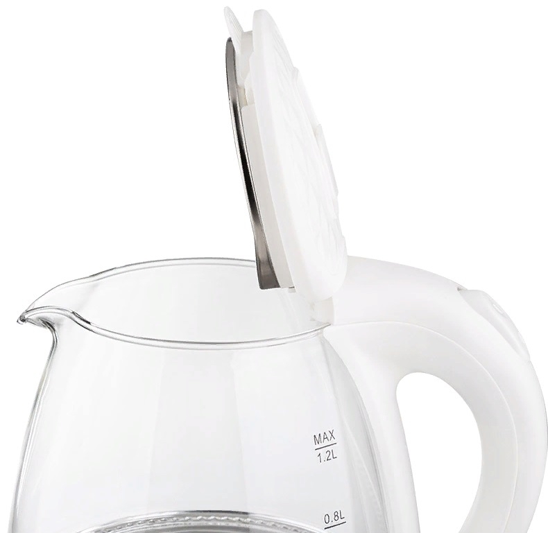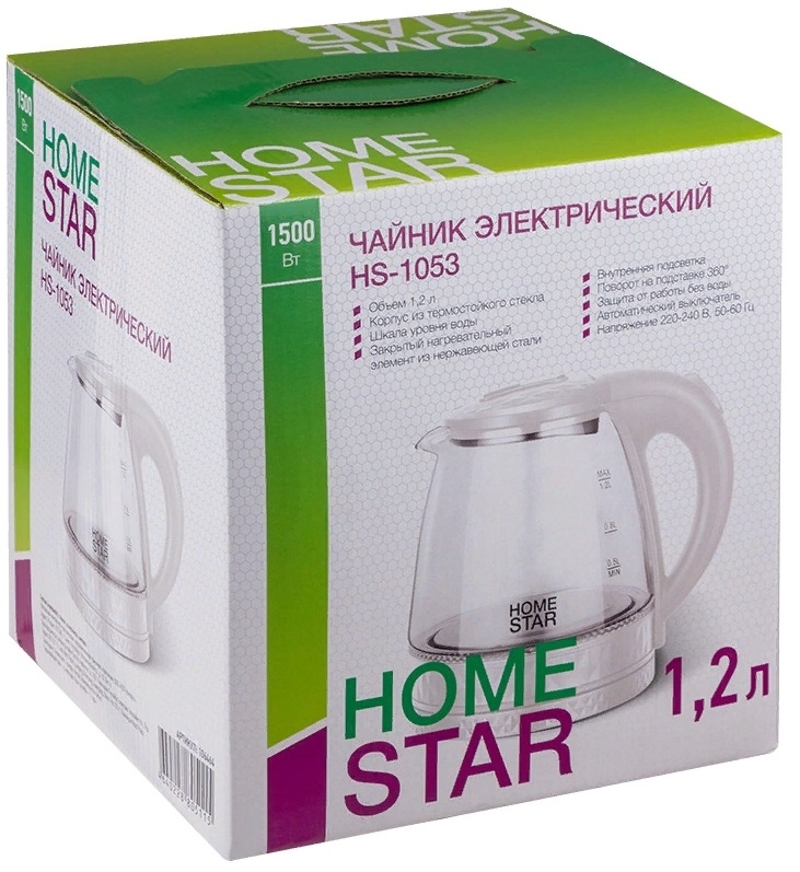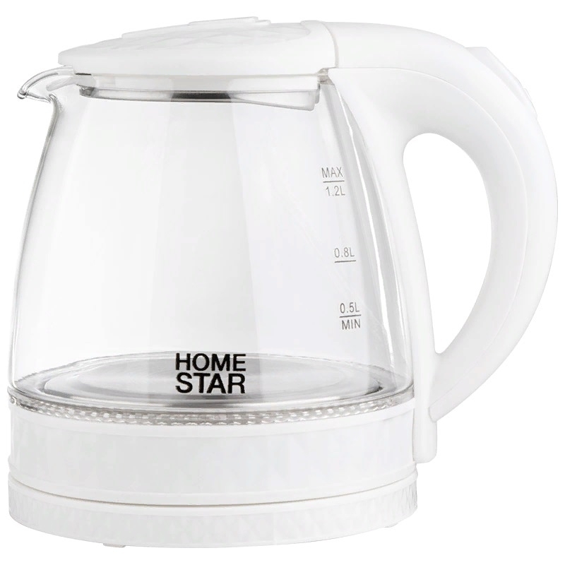 Чайник Homestar объемом 1,2 л. Корпус изготовлен из термостойкого стекла. Имеется шкала уровня воды. Внутренняя подсветка. Закрытый нагревательный элемент из нержавеющей стали. Поворот на подставке 360 градусов. Защита от работы без воды. Автоматический выключатель. Место для хранения шнура.Чайник имеет мощность 1500 Вт. Цвет белый. Материал корпуса- стекло и пластик. Электрический чайник белого цвета подойдет под любой интерьер.
