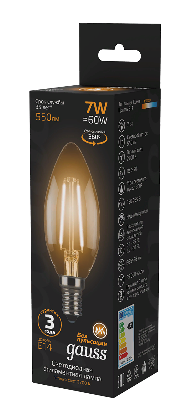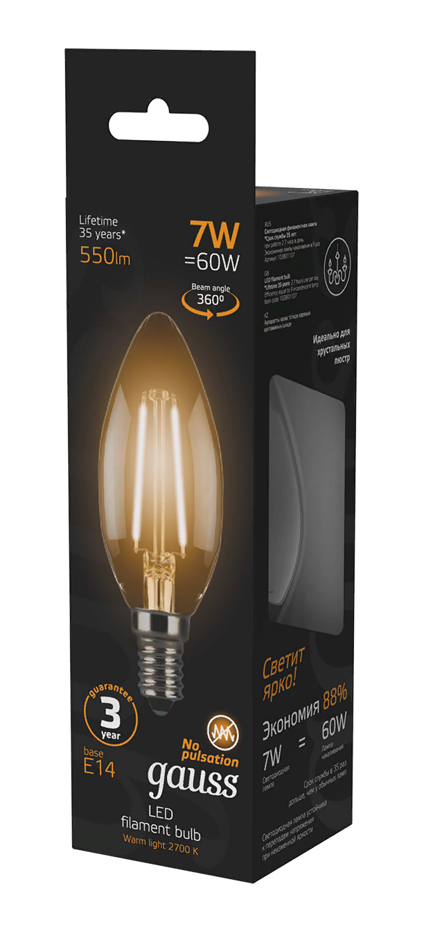 - Светодиодная лампа Gauss Filament свеча, С35 Е14 2700К 7Вт 550Лм, 103801107 - 1шт.