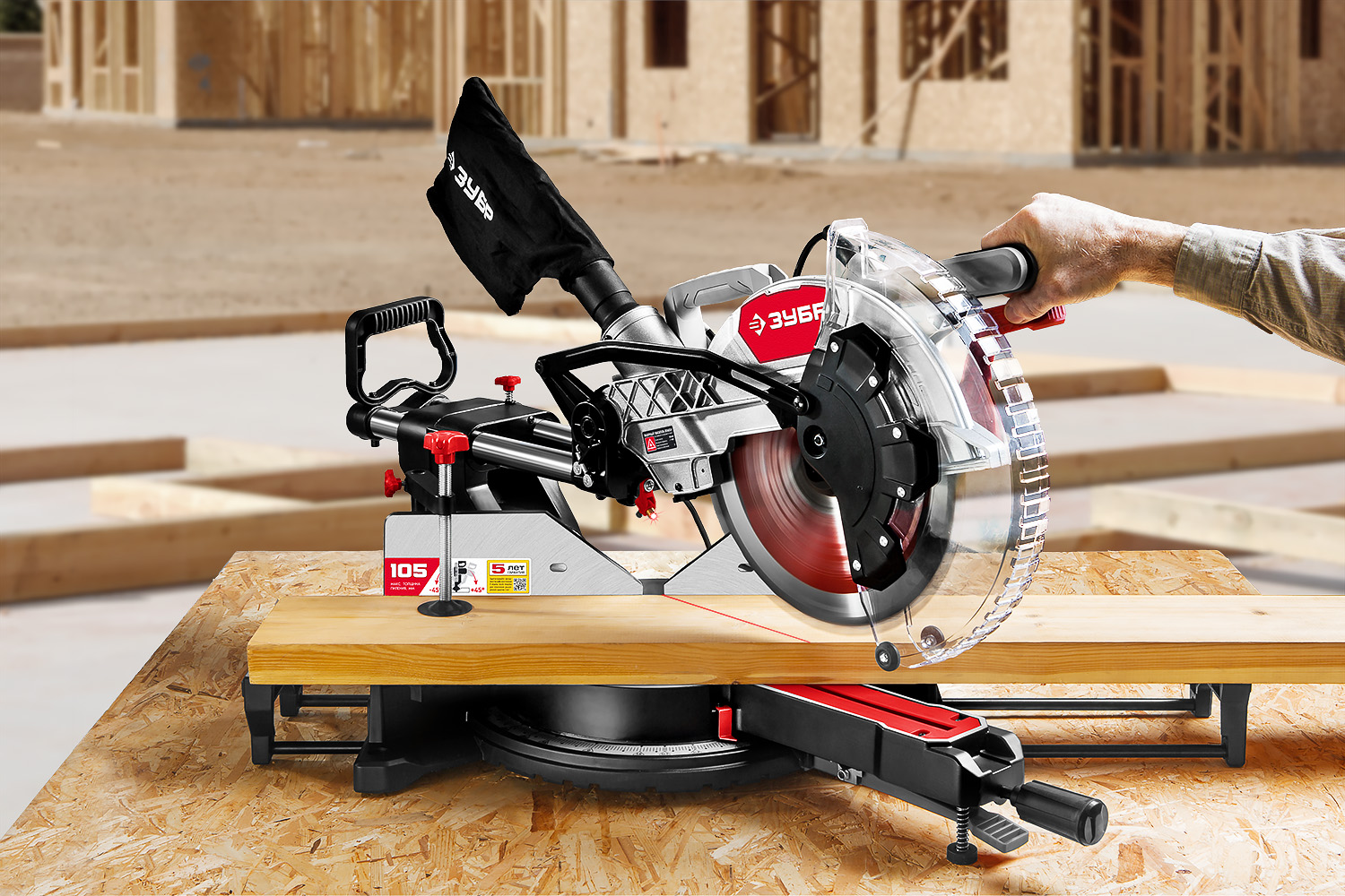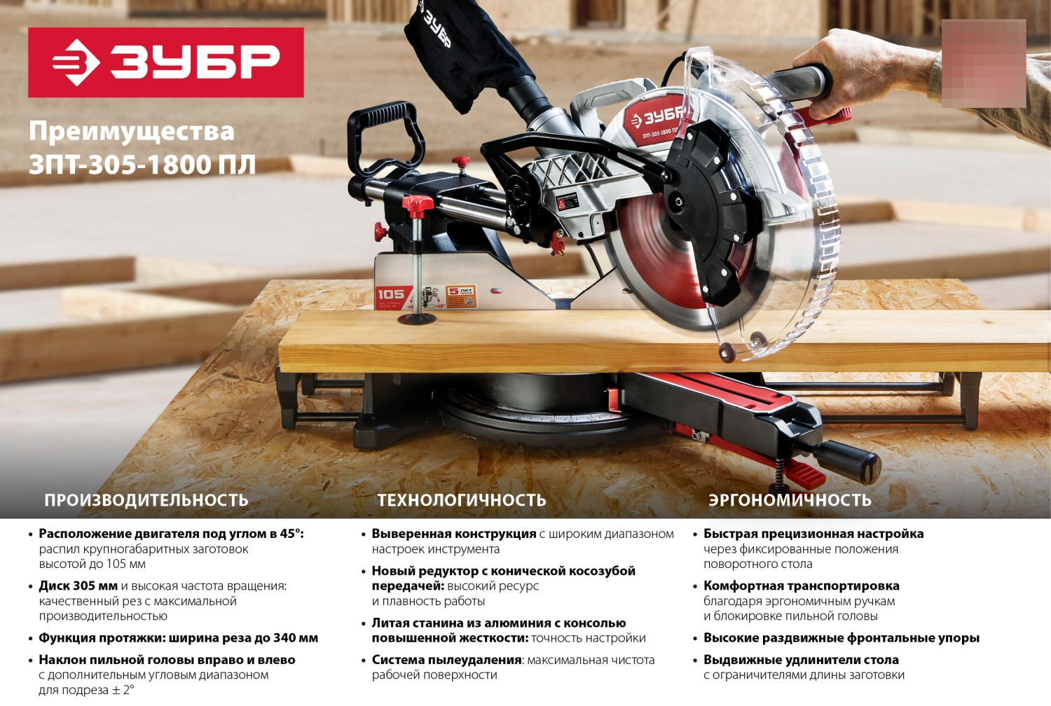 Торцевая пила Зубр сочетает высокую производительность с продуманной системой безопасности. Она станет оптимальным решением для мастерской или строительной площадки.