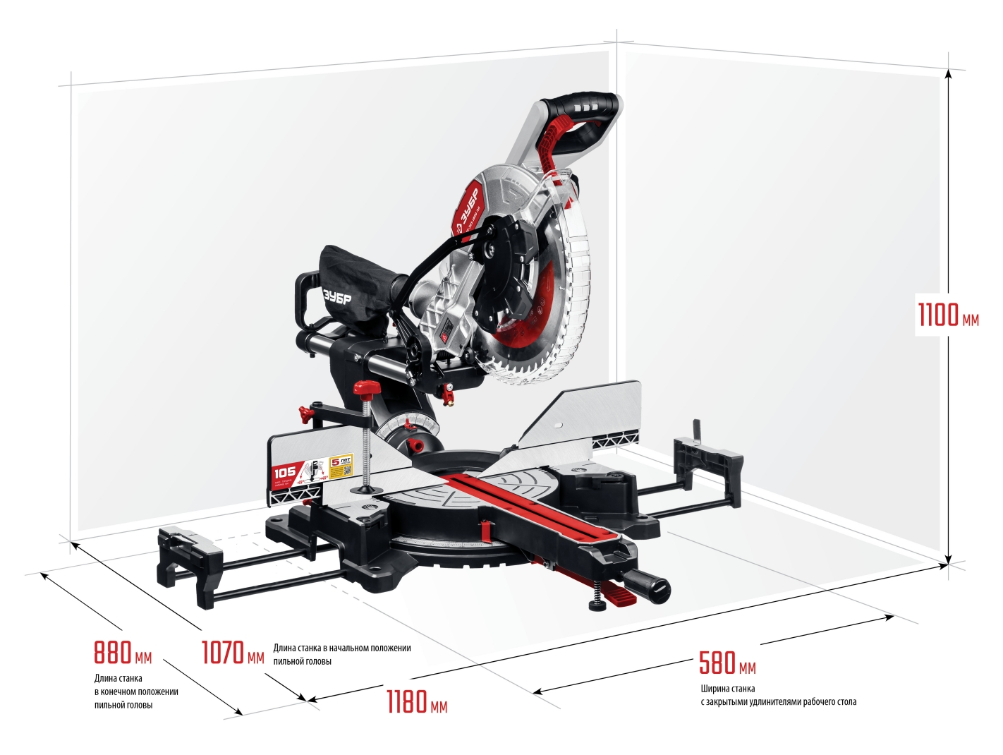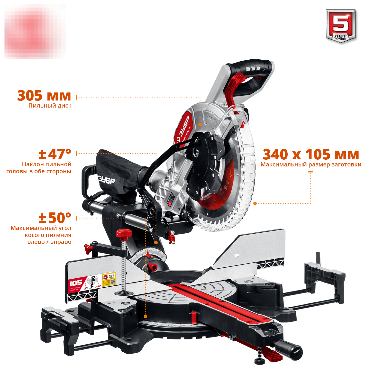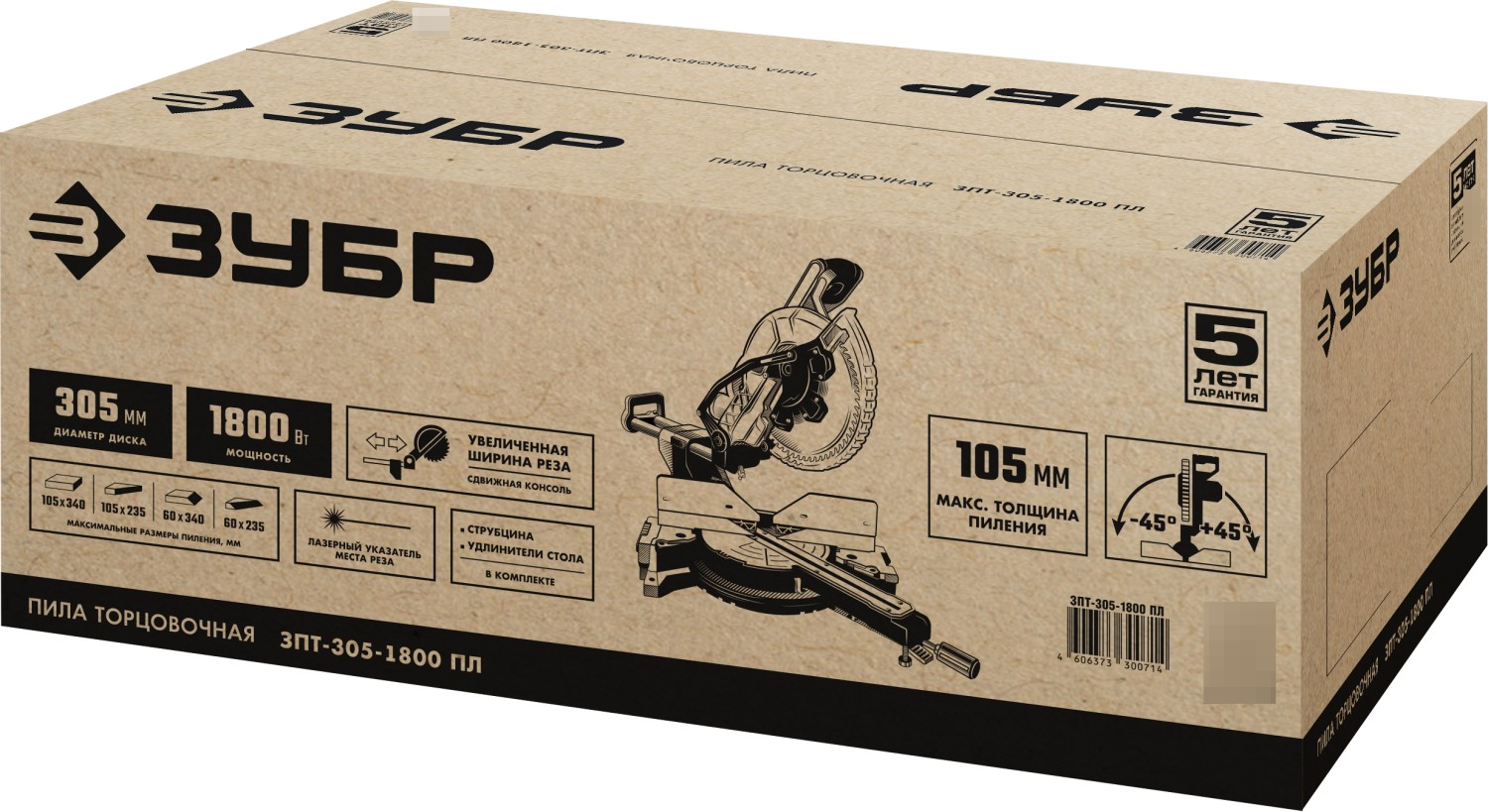 Пила торцовочная Зубр ЗПТ-305-1800 ПЛ сетевая, диск 305мм, посадочный диаметр 30мм, мощностью 1800Вт / электроинструмент