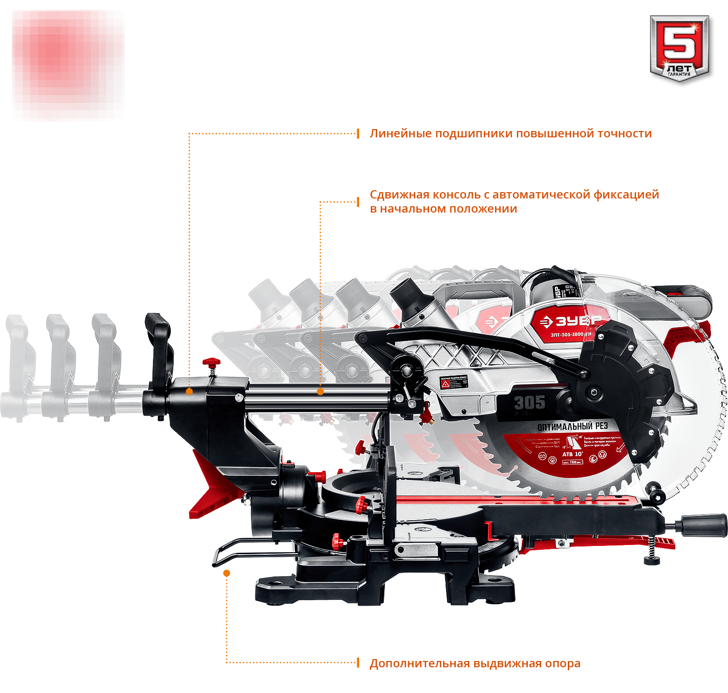 — Увеличенная ширина пиления благодаря сдвижной голове диска и диску максимального диаметра.