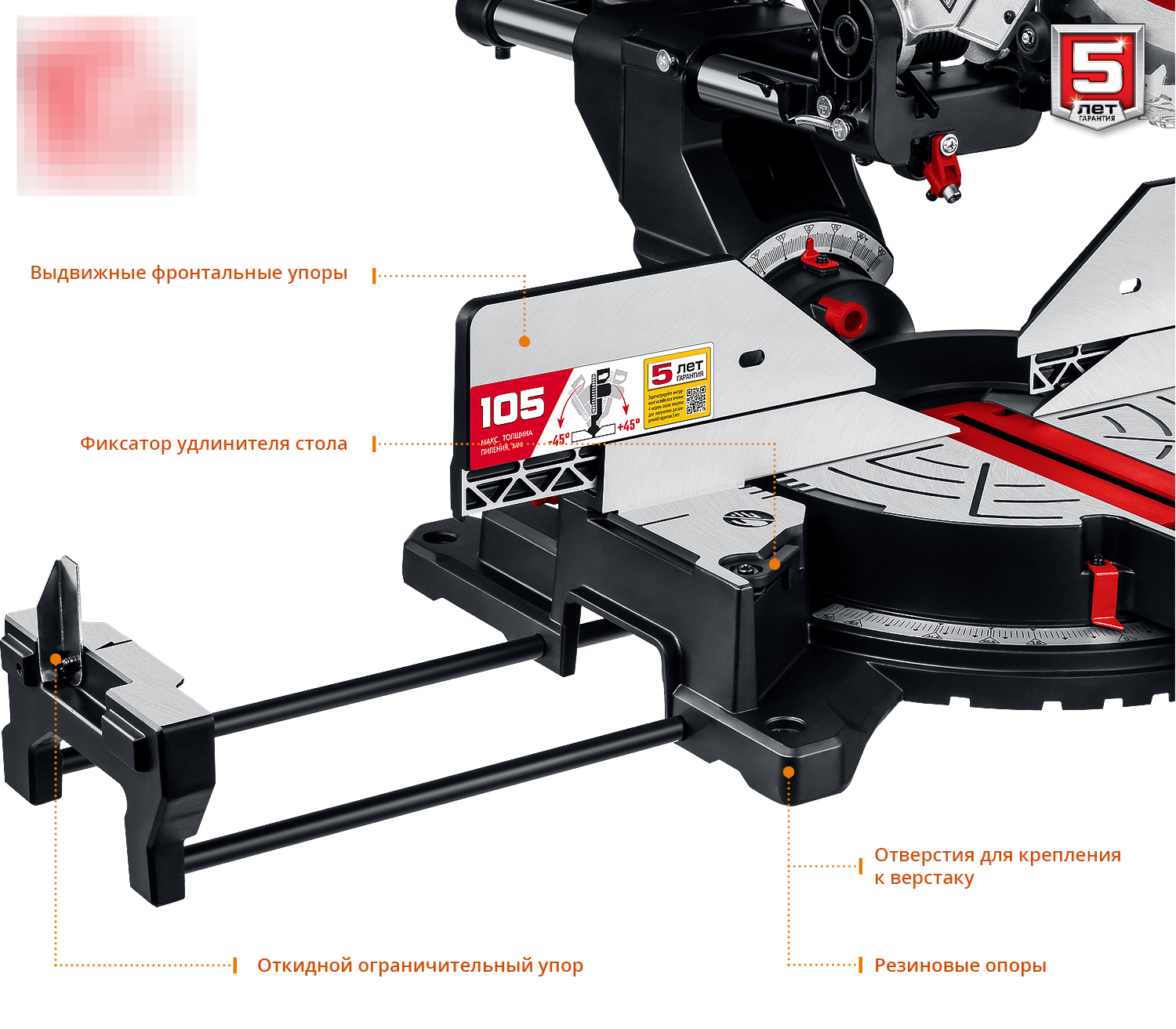 — Удлинительные опоры стола предотвращают опрокидывание отпиленной заготовки, что повышает безопасность.