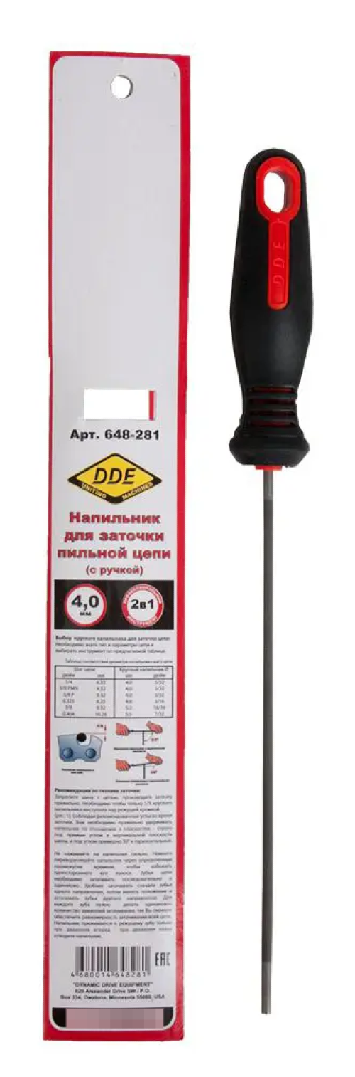 Напильник круглый 4,0 мм — 5/32 DDE 648-281 используется при заточке и правке пильных цепей, не снимая их с бензопилы. Напильник подходит для заточки цепей с шагом ¼", 3/8 PMN, 3/8 P. Пластиковая ручка удобно лежит в руке.
