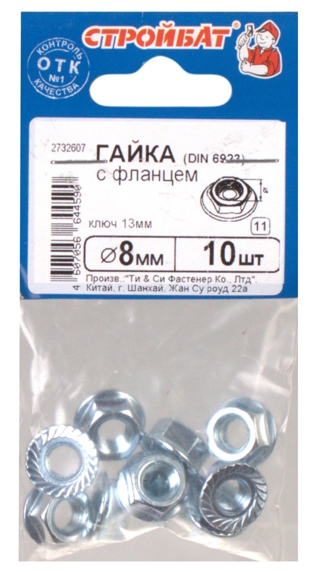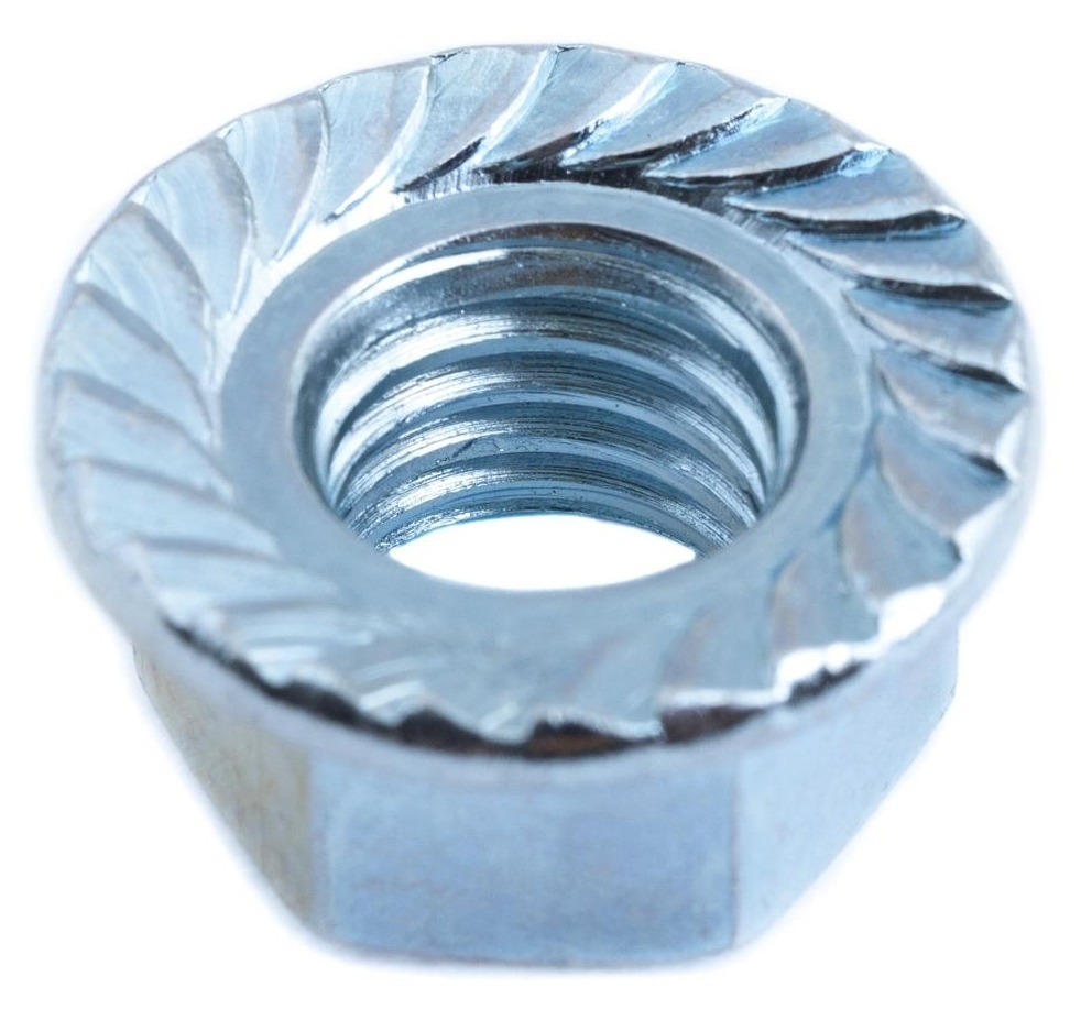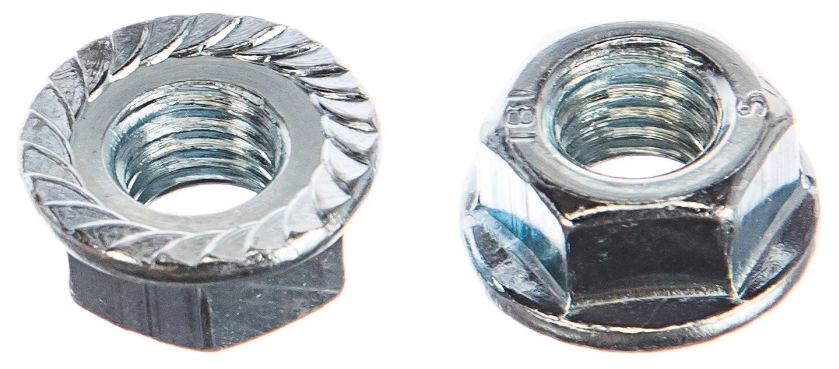 Применение: в машиностроении и деревообрабатывающем производстве. Гайки с фланцем используются для соединения элементов конструкций вместе с болтами, шпильками аналогичного диаметра. На фланце имеется рифление, которое обеспечивает надежную фиксацию гайки и предотвращает ее откручивание. Материал изготовления: сталь; покрытие: цинк. Резьба: метрическая М8.