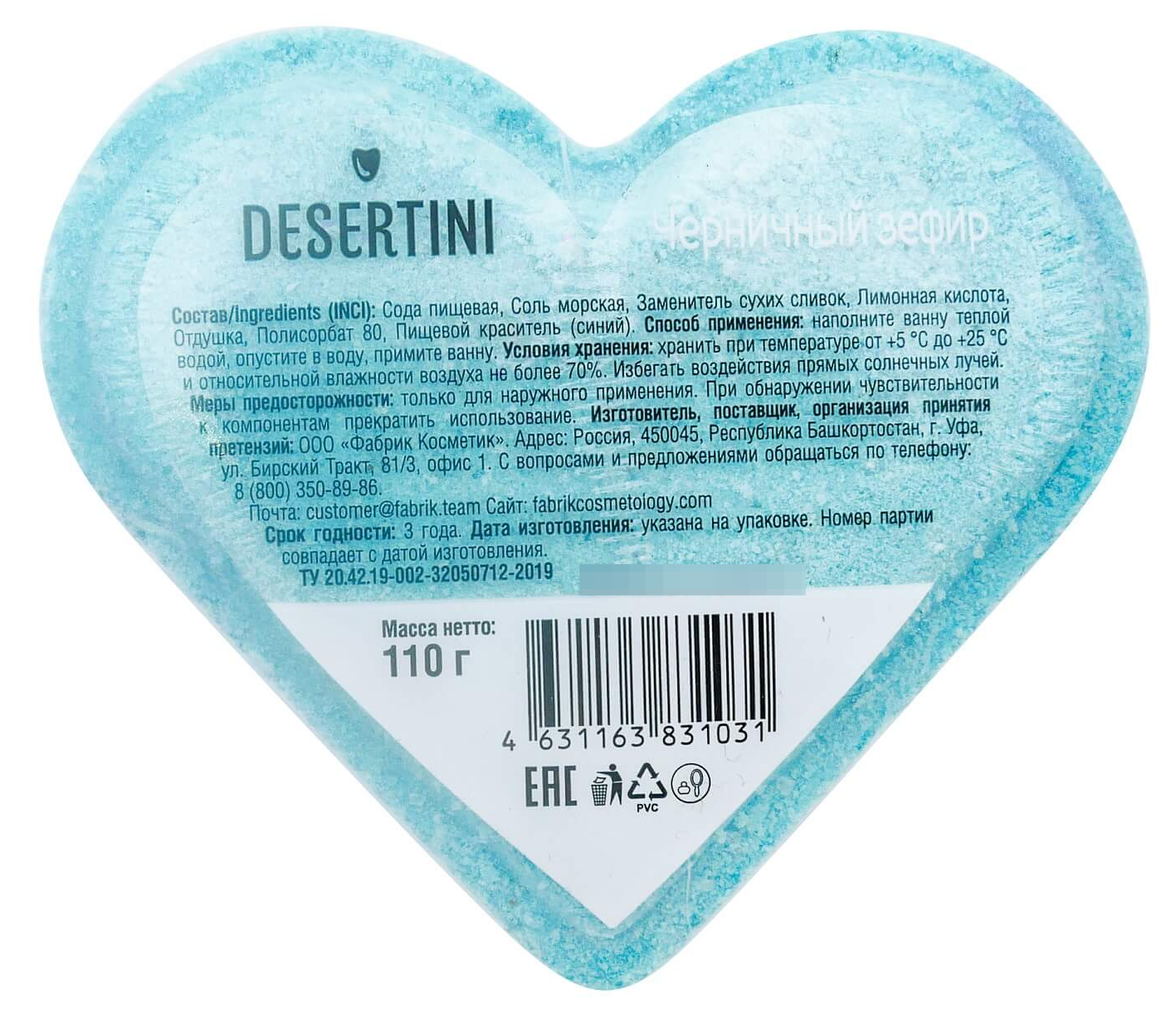 Бомба для ванны Desertini Черничный зефир реализуется в индивидуальной упаковке — пакете. В ее составе содержатся следующие компоненты: Сода пищевая, Соль морская, Заменитель сухих сливок, Лимонная кислота, Отдушка, Полисорбат 80, Пищевой краситель (синий). Вес — 110 г.
