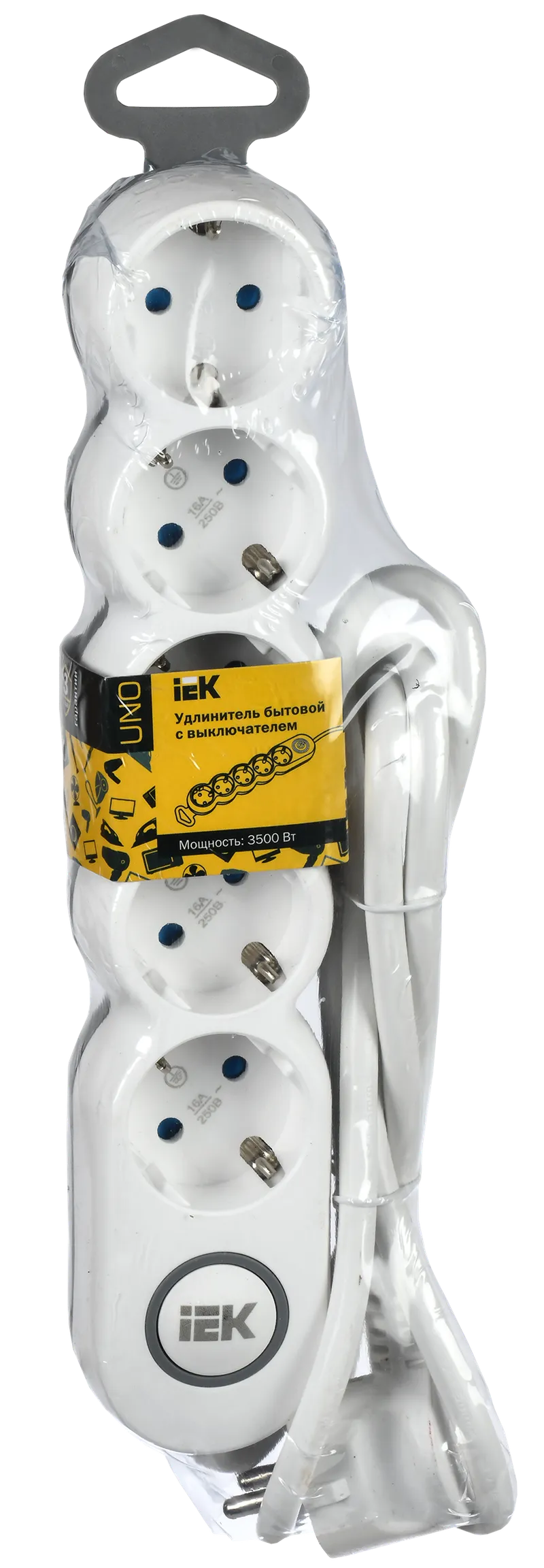 Удлинитель бытовой IEK / ИЭК UNO У05В с заземляющими контактами и выключателем, 16А 250В ПВС 3х1.5мм2, 1.5 метра 5 розеток, белый, WYP53-16-05-D15-ZK