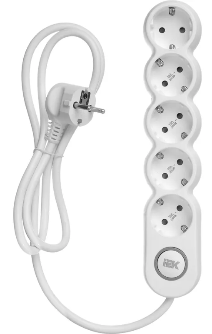 - Удлинитель бытовой IEK UNO У05В с заземляющими контактами и выключателем, 16А 250В ПВС 3х1.5мм2, 1.5 метра 5 розеток, белый, WYP53-16-05-D15-ZK - 1шт.