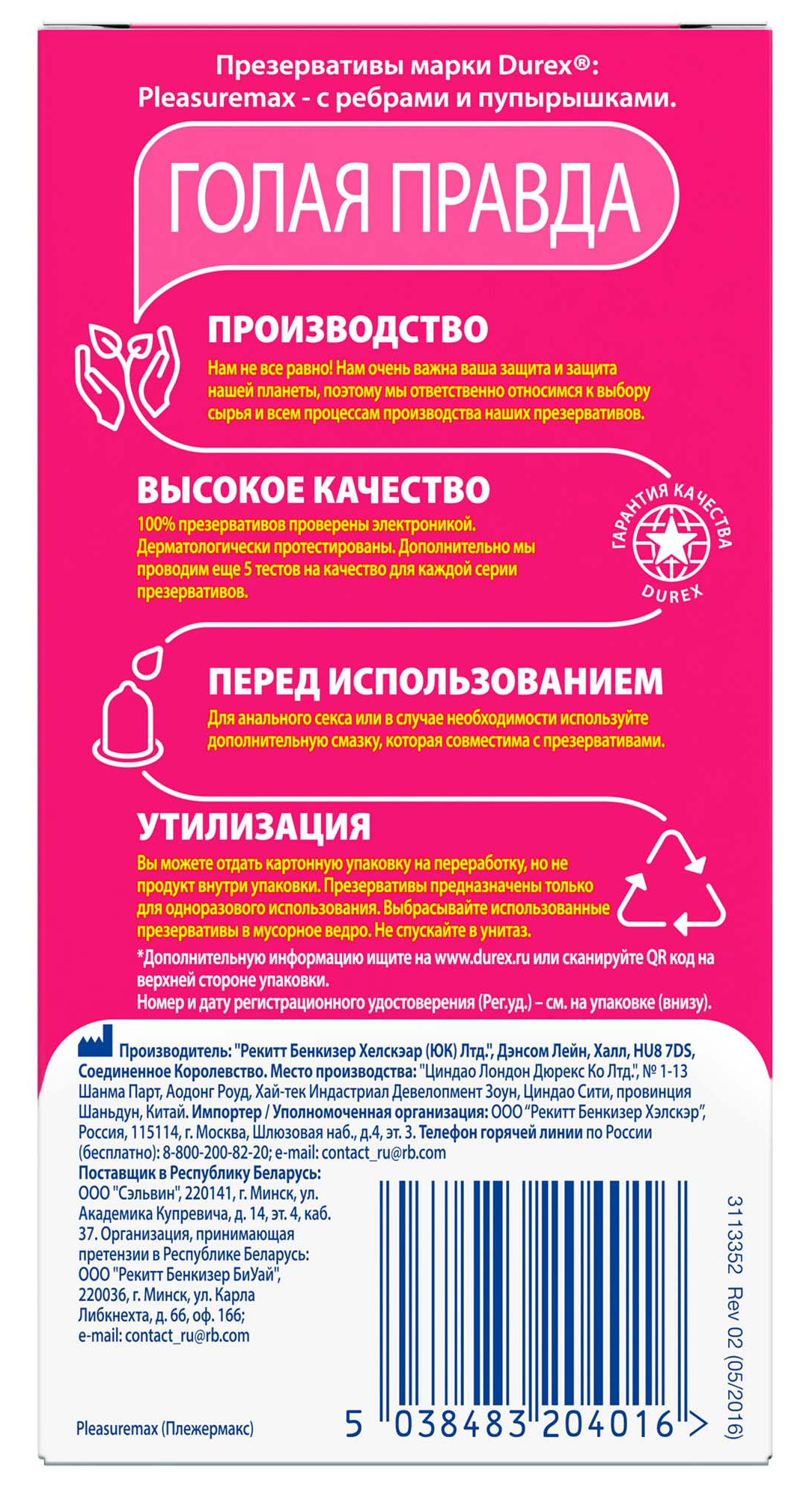 Презервативы Durex Pleasuremax с ребрами и пупырышками — это надежные и комфортные презервативы из ультрамягкого тонкого латекса премиального качества со смазкой. Презервативы Durex обеспечивают высокий уровень комфорта, не передавливают и не спадают, удобные и надежные. Высокое качество и абсолютная надежность — вот, что помогает сохранить романтику в момент близости.