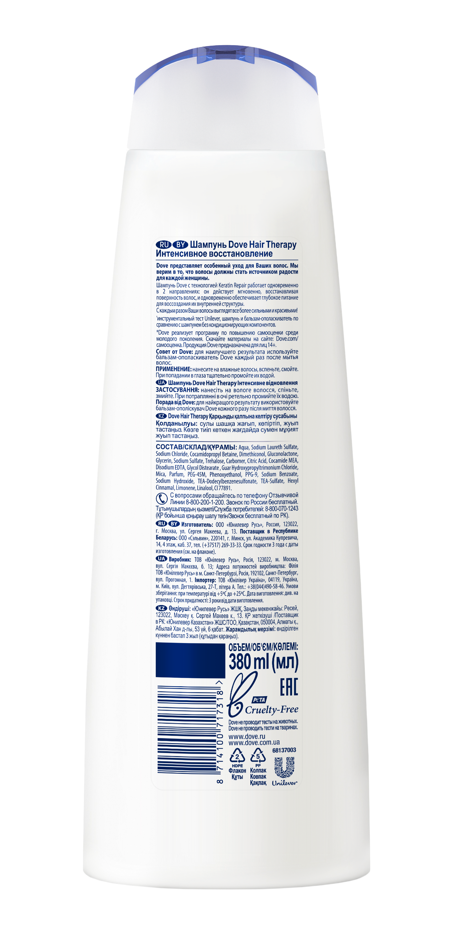 Шампунь женский Dove реализуется в оригинальной емкости объемом 380 мл. Подходит для ежедневного применения. Особенности применения: наносится на влажные волосы, вспенивается массажными движениями, а затем смывается.