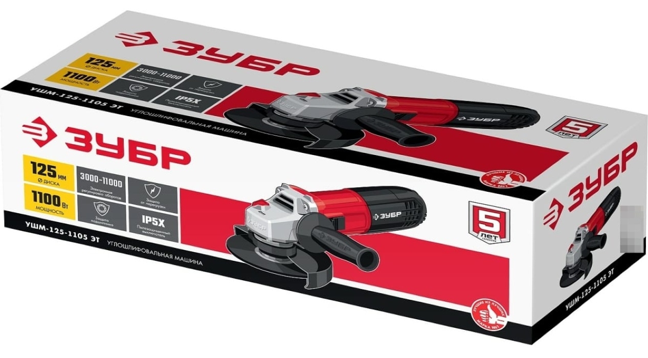 Шлифмашина угловая Зубр УШМ-125-1105 ЭТ сетевая, посадочный диаметр 22.2мм, М14, диск 125мм, 230В, 11000об/мин, 1100Вт / болгарка