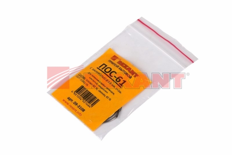 - Припой REXANT ПОС-61, с канифолью, Sn61/Pb39, сечение 0.8мм, температура пайки 190°С - 1шт.