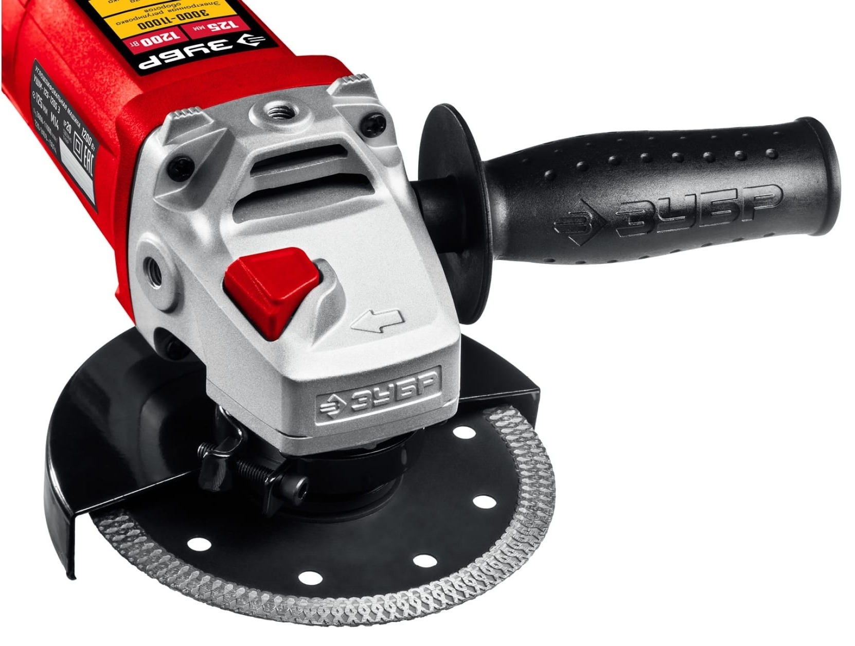 Шлифмашина угловая Зубр УШМ-125-1205 Э сетевая, посадочный диаметр 22.2мм, М14, диск 125мм, 230В, 11000об/мин, 1200Вт / болгарка