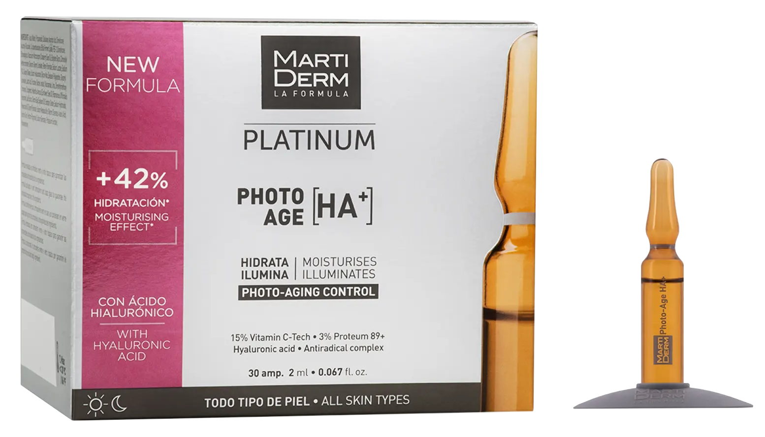 Ампулы Photo-Age HA+ — это новая супер увлажняющая версия ампул Photo-Age. Это результат синергии между витамином С, Proteum 89+ и, теперь, гиалуроновой кислотой. Это легко впитываемый блистер, который увлажняет и осветляет кожу, а также разглаживает и предупреждает появление морщин, достигая более упругой кожи.