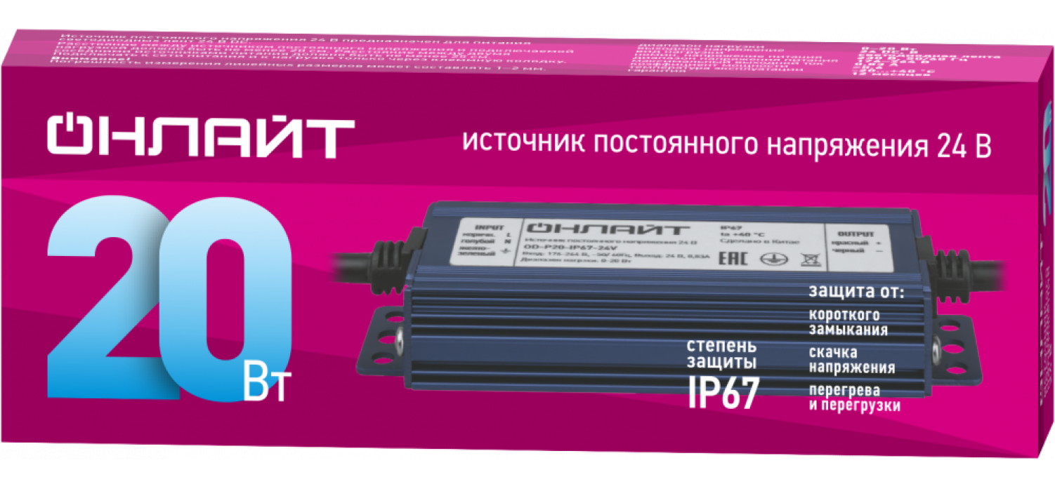 Драйвер для светодиодных светильников ОНЛАЙТ OD-P20-IP67-24V выделяется своими техническими характеристиками: