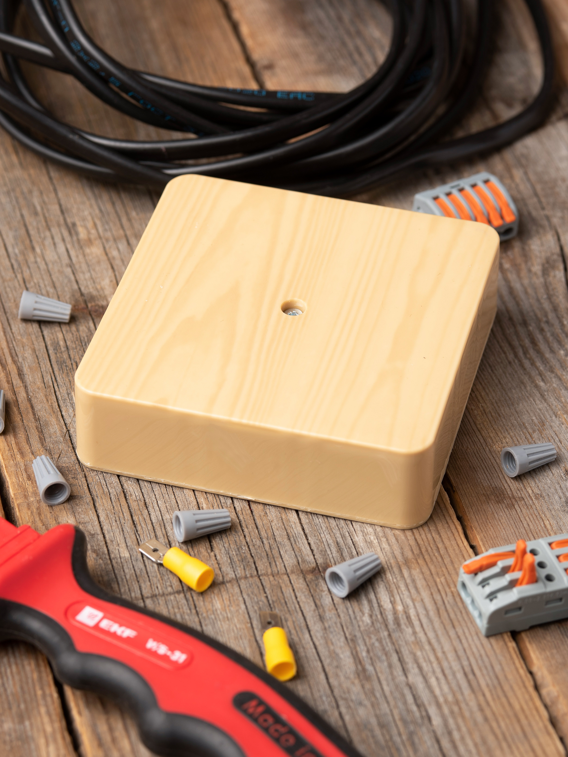 Распаячная коробка EKF ROxima КМР-030-032кг имеет интересный дизайн, выполнена в цвете светлое дерево. Она прекрасно впишется в любой интерьер и скроет неприглядные стыки.