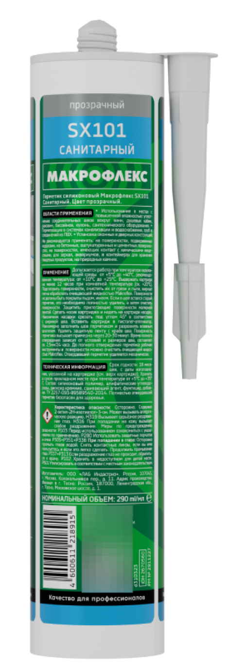 Герметик силиконовый санитарный «Макрофлекс SX101». Цвет бесцветный. Универсальный однокомпонентный герметик на основе силиконового полимера (ацетокси). Высококачественный однокомпонентный силиконовый санитарный герметик для герметизации и заполнения швов и стыков. Герметик предназначен для использования в помещениях с повышенной влажностью: ванных комнатах, душевых кабинах, туалетных комнатах, кухнях, при остеклении и т. д. Применим при общих строительных и ремонтных работах как внутри, так и снаружи помещения. Содержит антисептическое средство, препятствующее образованию плесени. Хорошая адгезия к эмали, стеклу, керамике, дереву, металлам, эмалированным покрытиям. Устойчив к атмосферным и химическим воздействиям. Устойчив к воздействию ультрафиолетового излучения. Водостоек. Эластичен. Нельзя окрашивать.