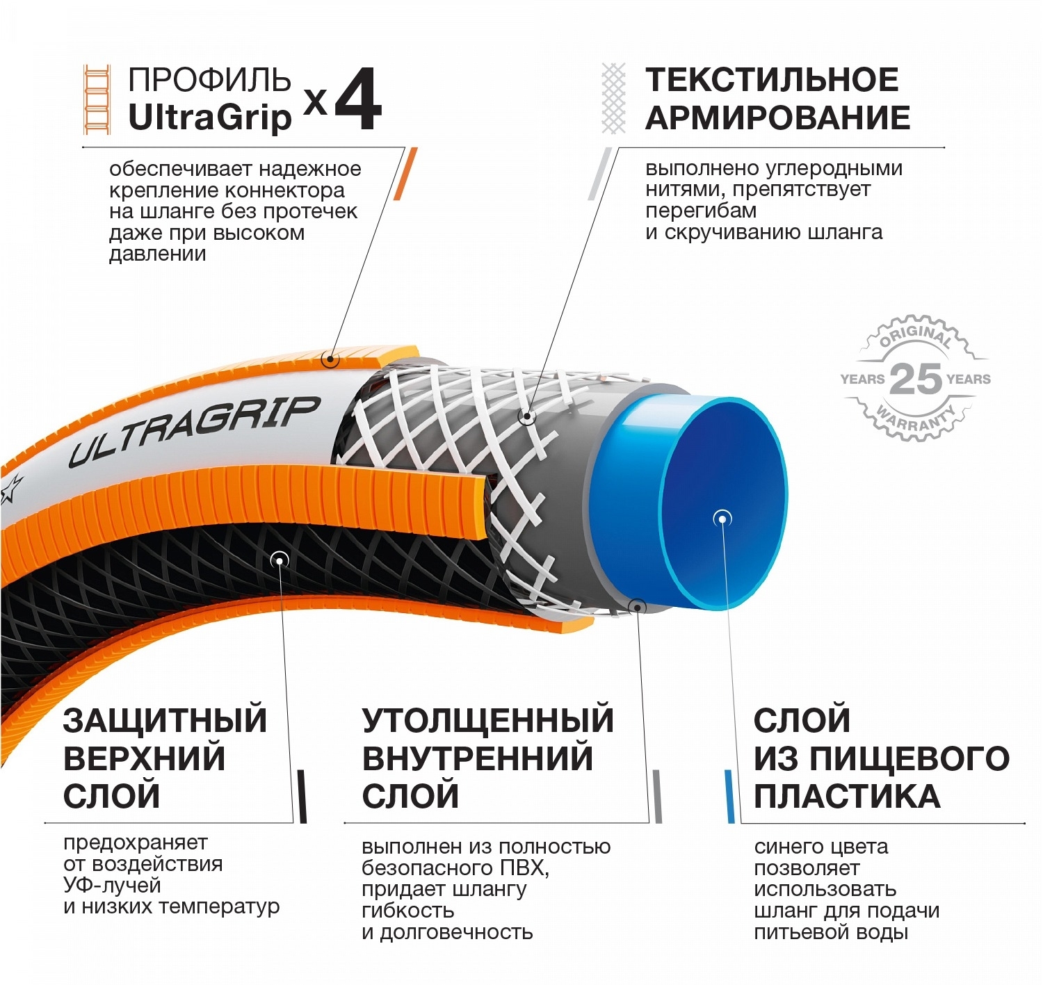 Изделие имеет многослойную конструкцию, которая гарантирует прочность и устойчивость к перегибам, заломам и УФ-лучам. Поливочный шланг очень легкий, что позволит без усилий перемещать его по участку, даже если нужно дотянуться до дальних грядок. Внутренний слой предотвращает образование водорослей, сохраняя воду чистой для растений.