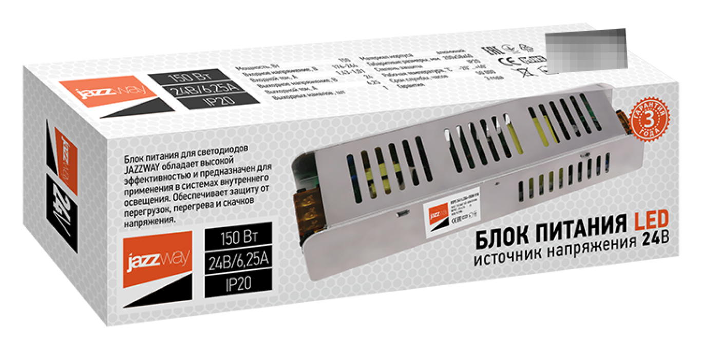 - Драйвер Jazzway BSPS для светодиодной ленты в металлическом корпусе серый, 200х58х40мм, 150Вт, 24V, IP20 - 1шт.