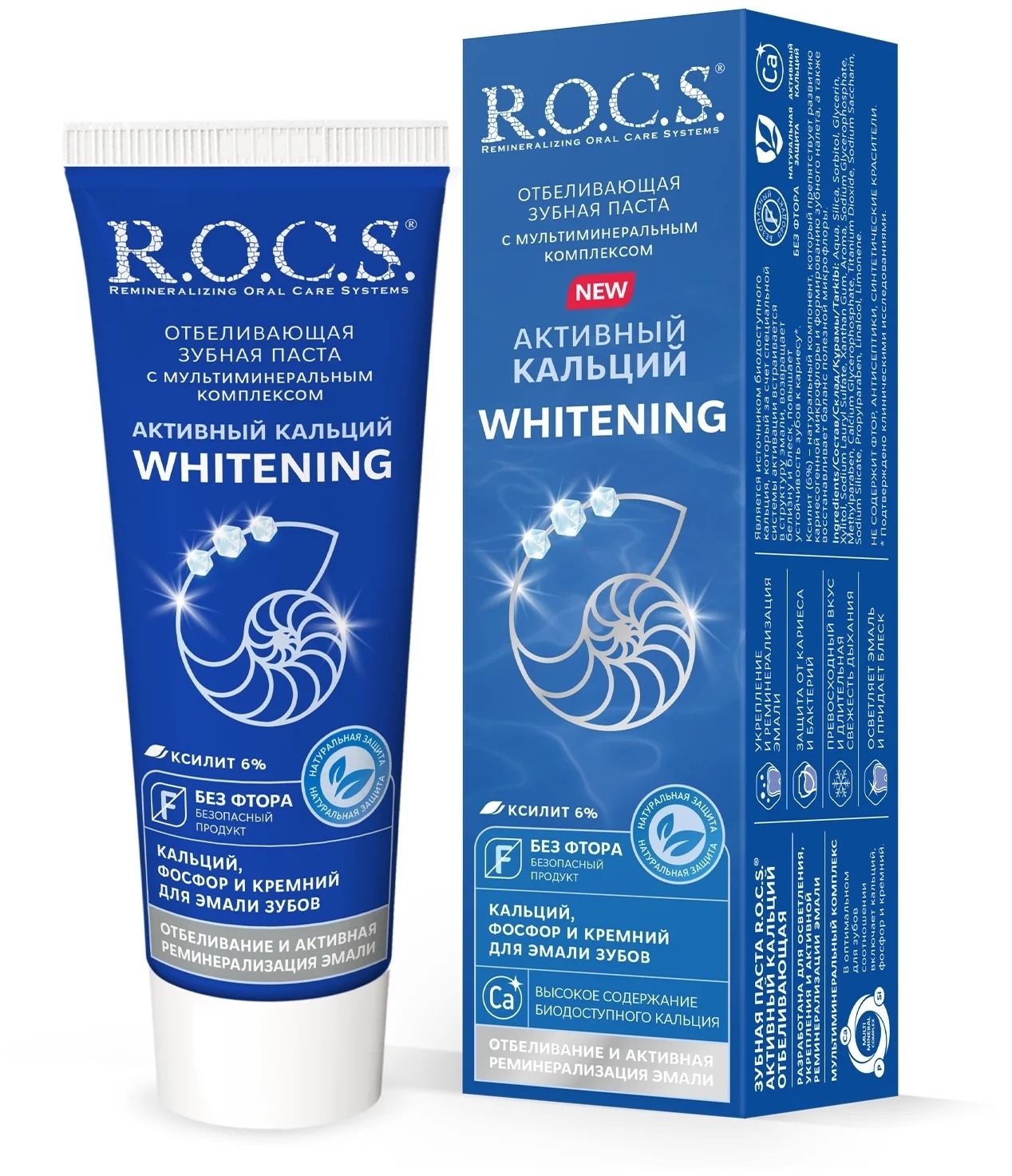 R.O.C.S. Активный кальций Зубная паста с высокоэффективным кальцием укрепляет эмаль и защищает зубы. Паста зубная предназначена для ежедневной гигиены полости рта с целью обеспечения длительной защиты от кариеса, снижения растворимости и укрепления зубной эмали. Кальций, содержащийся в зубной пасте, формирует устойчивый защитный слой на поверхности зубов, который обеспечивает длительную и высокоэффективную защиту от воздействия кислот.