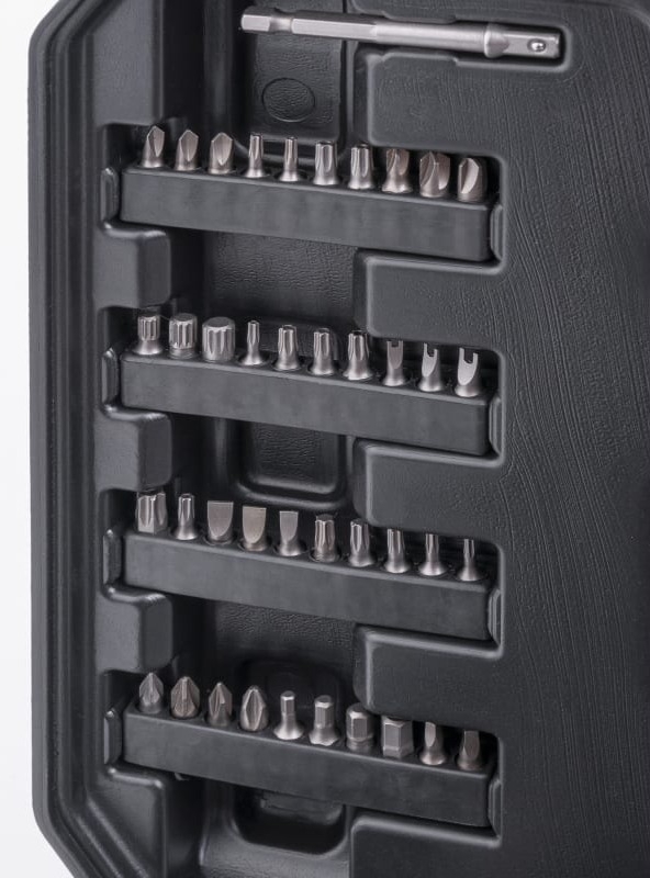 Набор инструмента профессиональный AV-011097 разработан для эксплуатации с крепежом нестандартных типов. Это позволяет эффективно работать в мастерских и с современными автомобилями. Комплект поставляется в кейсе. Дополнительно биты разложены по холдерам согласно типу и размеру. Это упрощает поиск и подбор подходящей оснастки.